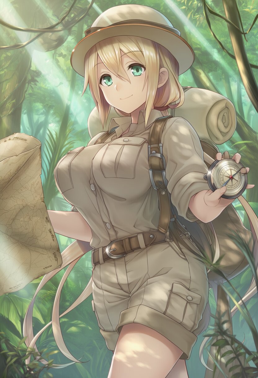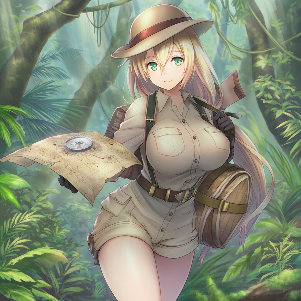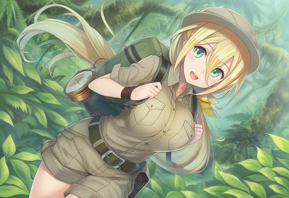 {{{highly detailed}}}, {{official style}}, {{game cg}}, {{intricate}}, {{{detailed beautiful eyes, detailed beautiful face, detailed beautiful face and eyes}}}, 1girl, solo, {{tenka hyakken}}, light green eyes, {{tareme}}, very long hair, {{straight hair}}, blonde hair, hair between eyes, low ponytail, large breasts, cowboy shot, walking, smile, compasses, maps, backpacks, jungles, {{{explorer hats, adventurous outfit, bowler light brown hat, collared light brown shirt, belt, cargo light brown shorts}}} determined expression, holding exploration gear, outdoors, {{{masterpiece}}}, {{{best quality}}}, {{ultra-detailed}}, {illustration}, {{an extremely delicate and beautiful}}