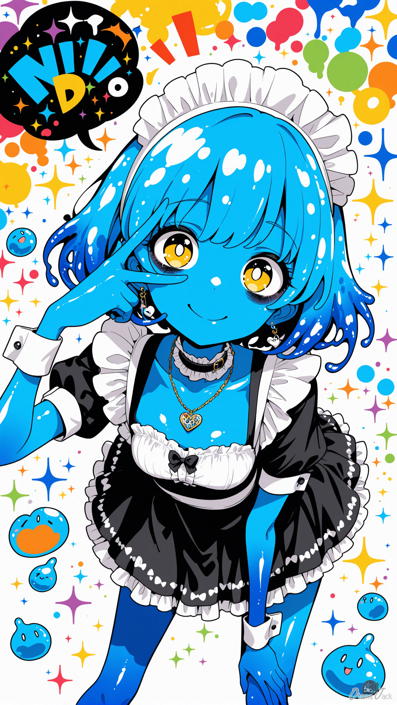 blue slime girl, blue hair, short hair, yellow eyes, closed mouth, smile, cheerful, +++, notice lines, choker, maid outfit,liquid hair, v over eye,bent over,