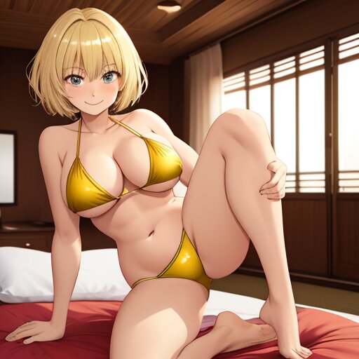 big_breasts, bedroom, bedroom_eyes, embarrasse, smile, age_40_woman, short_hair, blond_hair, gold_bikini, 1_woman_only, no_words, solo, sitting, one_leg_up, futon, voluptuous, camel_toe, futon
