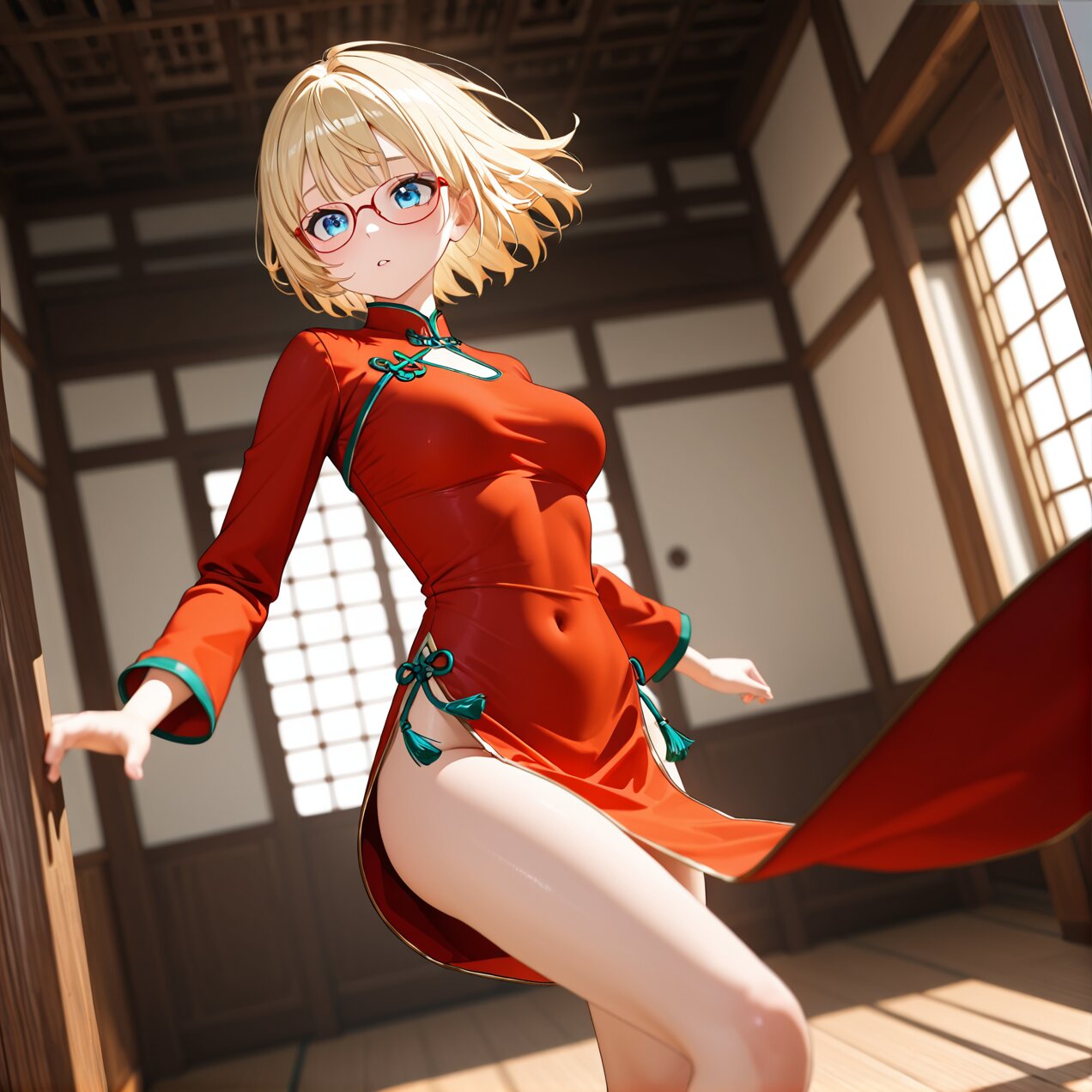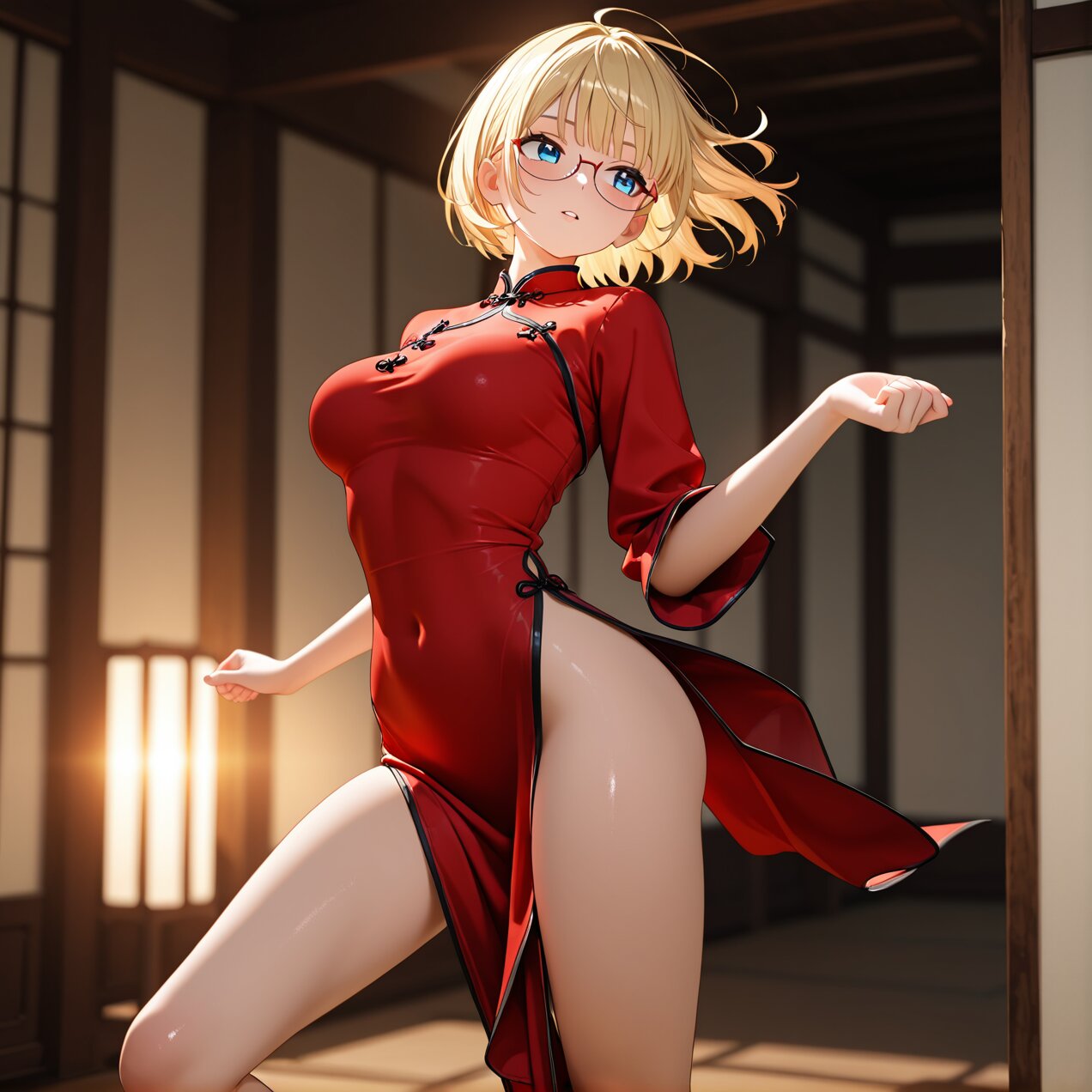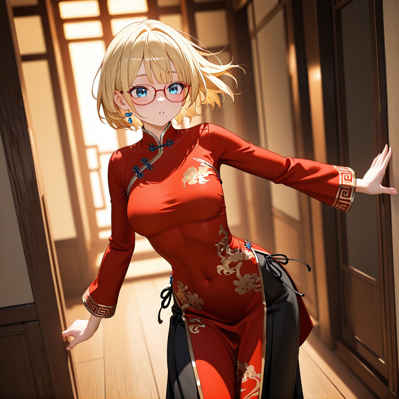 masterpiece, best quality, amazing quality, 4k, very aesthetic, high resolution, ultra-detailed, absurdres, newest, scenery, 3d, rendered, 1girl, solo, glasses, choppy bangs, parted lips, blue eyes, blonde hair, short hair, red qipao, in motion, motion blur, dynamic pose, medium breasts, dynamic, standing, floating hair, BREAK, hands, vignetting, dramatic shadow, cinematic lighting, rim light, detailed background, depth of field, vignetting, volumetric lighting