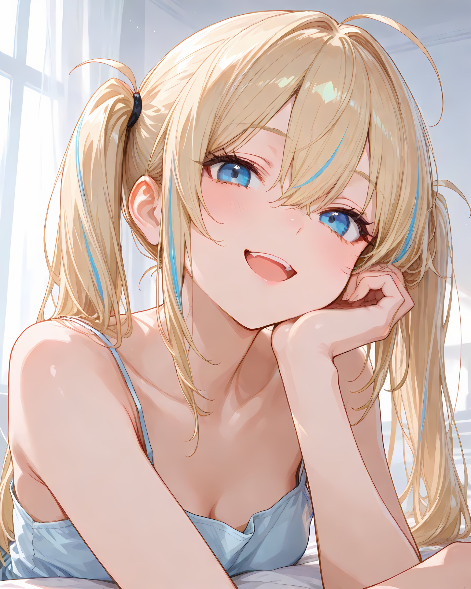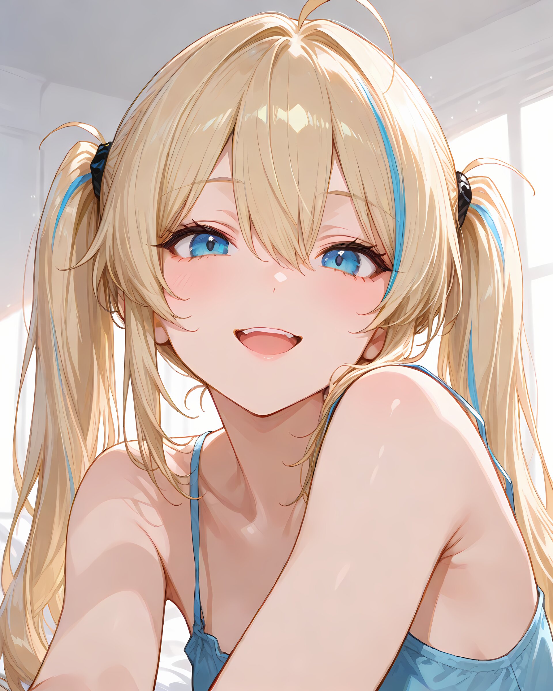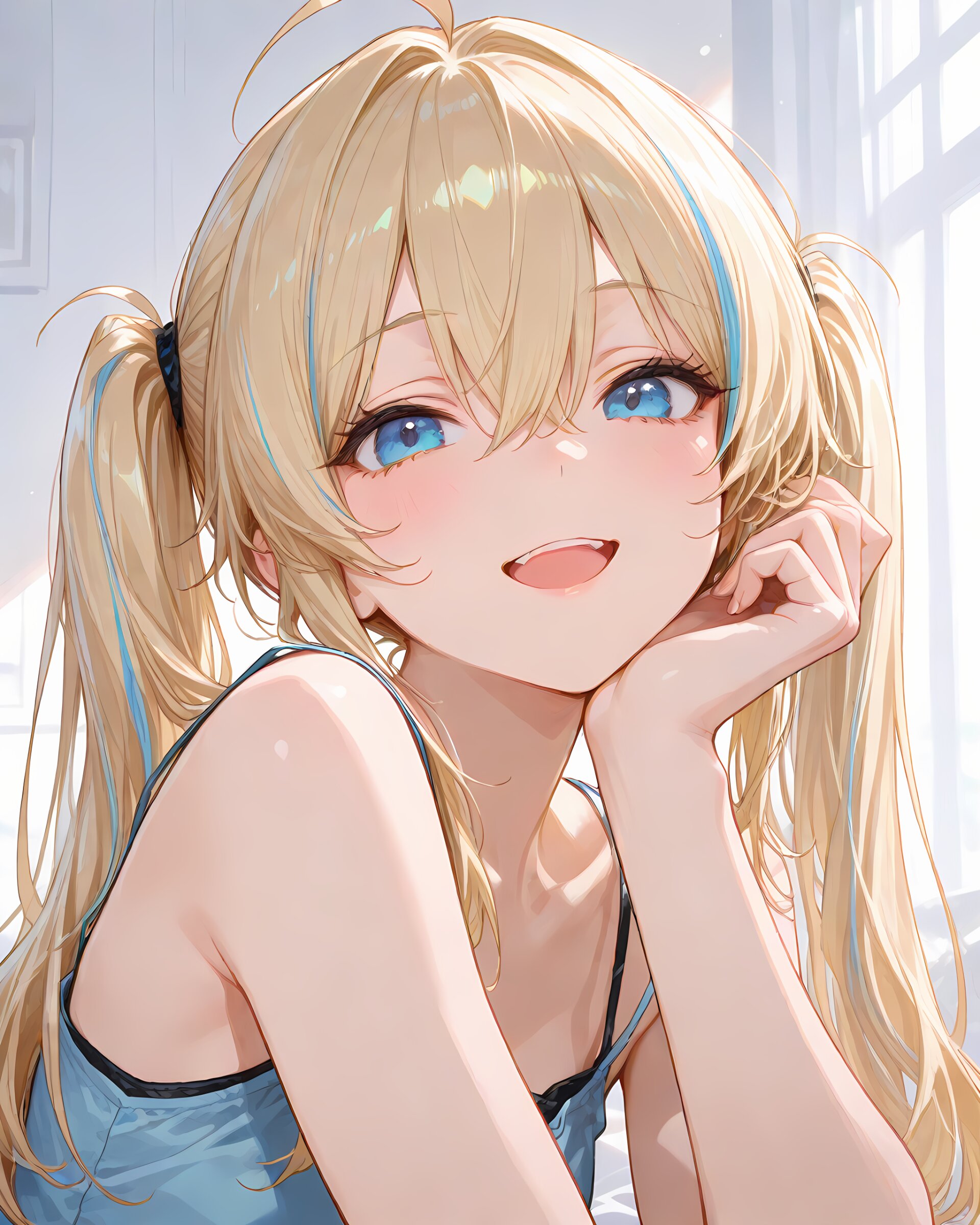 <lora:hyper_sdxl_8_step_lora_f16:1>,, 1girl, twintails, long hair, blue eyes, blonde hair, blue streaked hair, ahoge, bangs between eyes, tank-top, spaghetti strap, elegant pose, smile, open mouth, looking viewer, focus face, close-up, BREAK masterpiece, amazing quality, best quality, very aesthetic, ultra-detailed,
