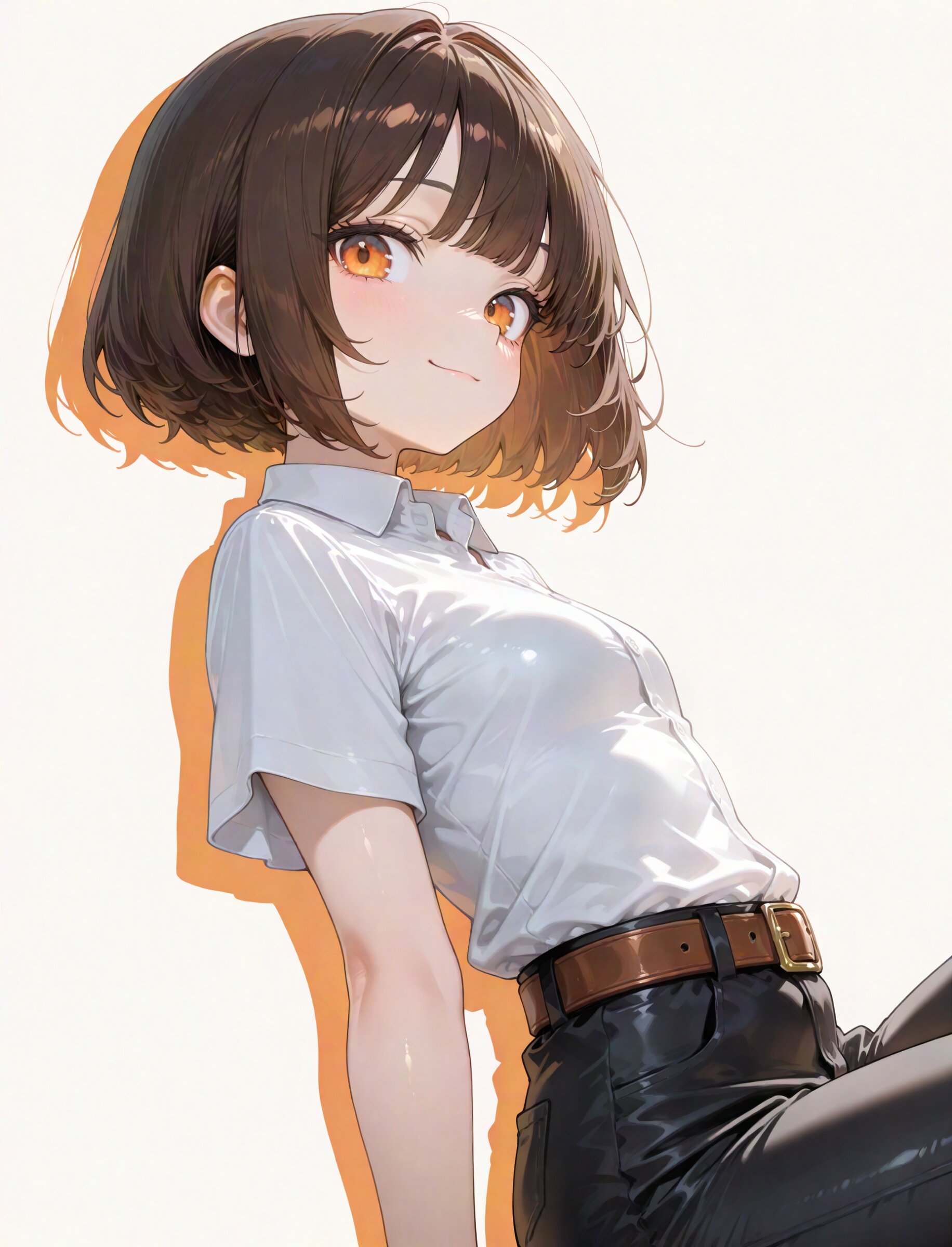 super fine concept art, hard surface, 8K, masterpiece, best quality, amazing quality, very aesthetic, absurdres, , Over the Shoulder Shot, looking back, (low angle shot:1.15) , (dutch angle:1.2), 1 girl, 27yo, short hair, dark brown hair, orange eyes, small breasts, tall female, bob cut, gently smile, , white collared shirt, tight shirt, belt, (simple light ivory background:1.1), drop shadow, colored shadow, figure four sitting, masterpiece, best quality, amazing quality, very aesthetic, absurdres, newest, professional art lots of details, , overexposure, shiny-glistening, (watercolor style:0.0), (pastel color style:0.0) 4ur4_illu,shiny, <lora:noline (1):-0.5> <lora:sdxl2-flat2-512b:-0.2> <lora:facelightup_xl_v10:0.5> <lora:V2_yakumo_alchemy:0.5> <lora:Aura_illu:0.1>