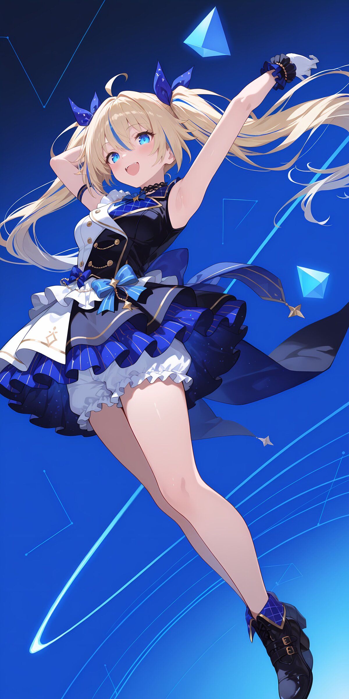 twintails, blue ribbon, long hair, blue eyes, (blonde hair, blue streaked hair:1.0), ahoge,bangs between eyes, medium breasts,