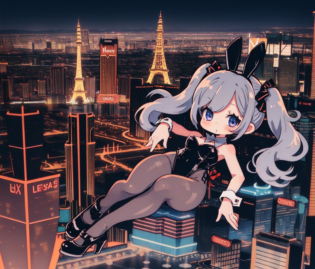 best quality, (solo,1girl,chibi:1.2),playboy bunny,twintails,(supine,on back:1.1),pantyhose, (Las Vegas cityscape isometric:1.1),magnificence,luxury, <lora:fineline_v1:1.0>