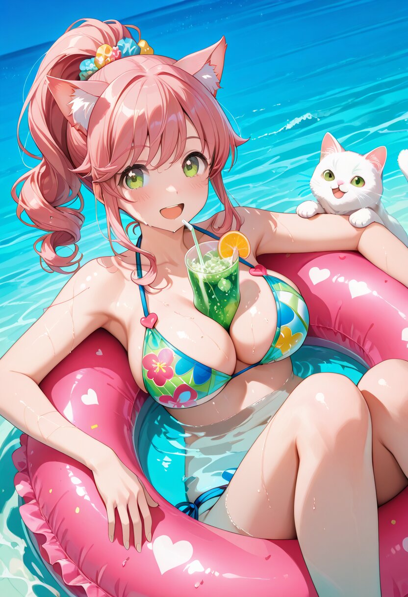 1girl, solo, Coco, cat girl, pink fluffy cat ears, pink hair, pink curly ponytail, large breasts, open mouth, vibrant green eyes, cheerful expression, big smile, peace sign, white cat, cherry barrette, drinking melon soda, melon soda placed between breasts, kawaii swim ring, heart pattern swim ring, afloat, floating light, dim lighting, on back, looking_at_viewer, sitting, knees_up, teasing viewer, dynamic_angle, kawaii colorful bikini, white base swimsuit with colorful patterns, vivid accents, playful design, (midsummer sea background), wet skin, ocean, summer, , (masterpiece, best quality, high quality, highres, ultra-detailed)