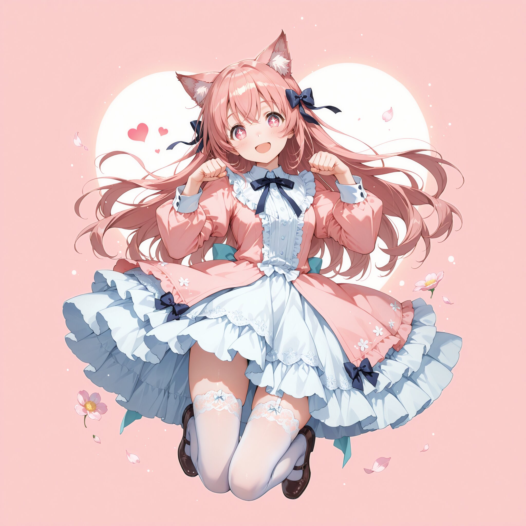 masterpiece, best quality, high quality, highres, ultra-detailed, open mouth, fluffy cat ears, front paw pose, heart, flower, bent legs, pale pink background, detailed eyes, dynamic pose, beautiful delicate anime girl, full body view, slender and cute build, luminous smooth skin, large sparkling eyes, soft silky hair gently swaying, layered frilled dress, soft pastel colors, puffed sleeves, lace trim, ribbon bows, fluffy skirt, airy volume, decorative lace-trimmed tights, small decorative accessories, ribbons, pearls, gentle and warm smile, anime-style soft dreamy background, gentle bokeh lights, faint floating petals, warm and cool light blending softly, subtle glitter particles drifting in the air, cinematic lighting, atmospheric depth, anime style, cute and vibrant illustration, 8k, highly detailed, summery atmosphere, warm lighting