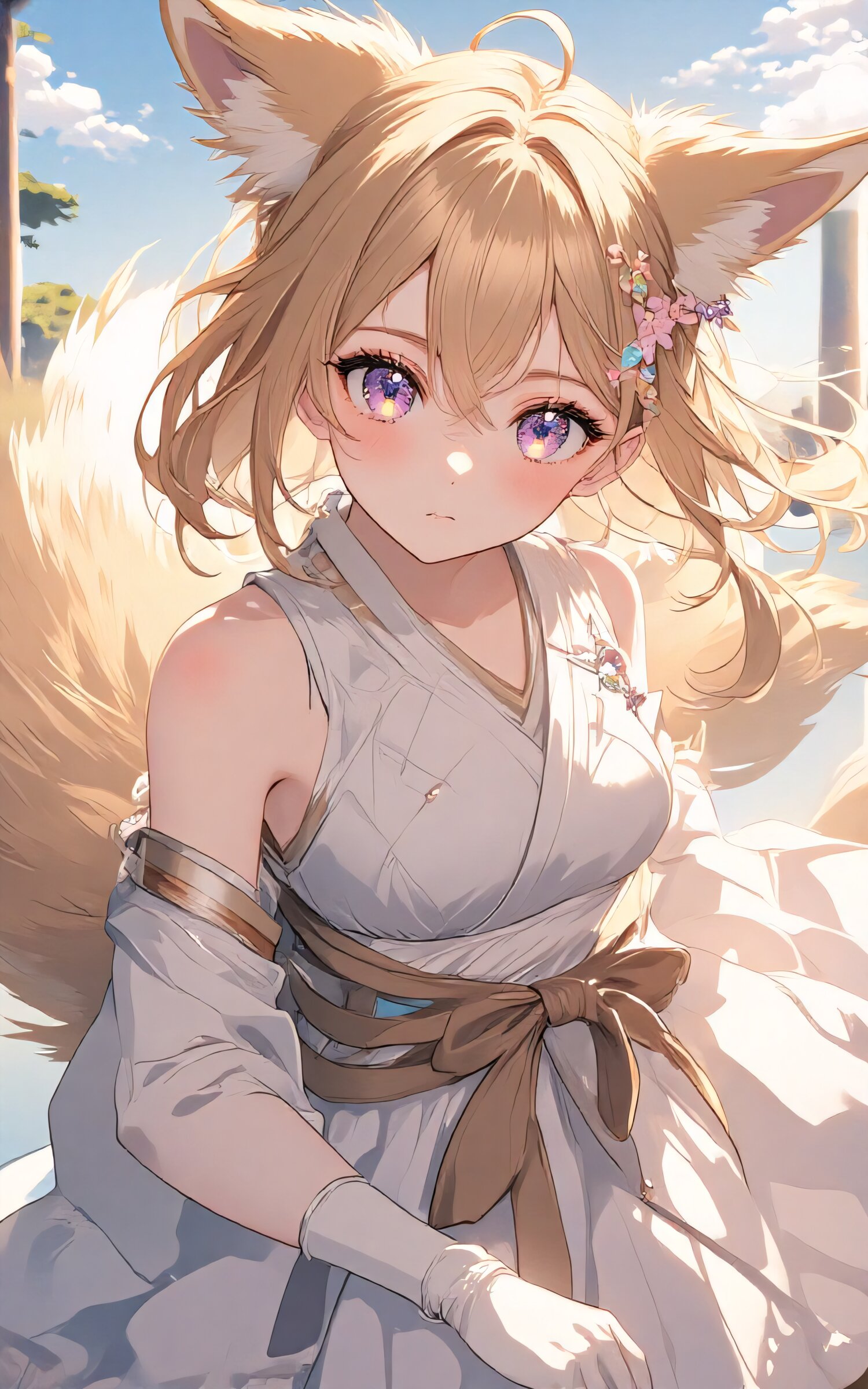 anime style, fox ears girl, light brown hair, long hair, double eyelids, long eyelashes, fluffy tail, dynamic pose, dynamic angle,, fox girl, gold Blond Hair, large breasts and fox ears, (swept bangs:1.2), (perfect purple eyes:1.3) long eyelashes aristocratic features tall girl has (Blond Hair long hair over ears:1.3) fox 9tails, (wearing White Japanese Cloth straw sandal silk gloves long skirt Obi boots:1.3), hair ornament flower, tabi