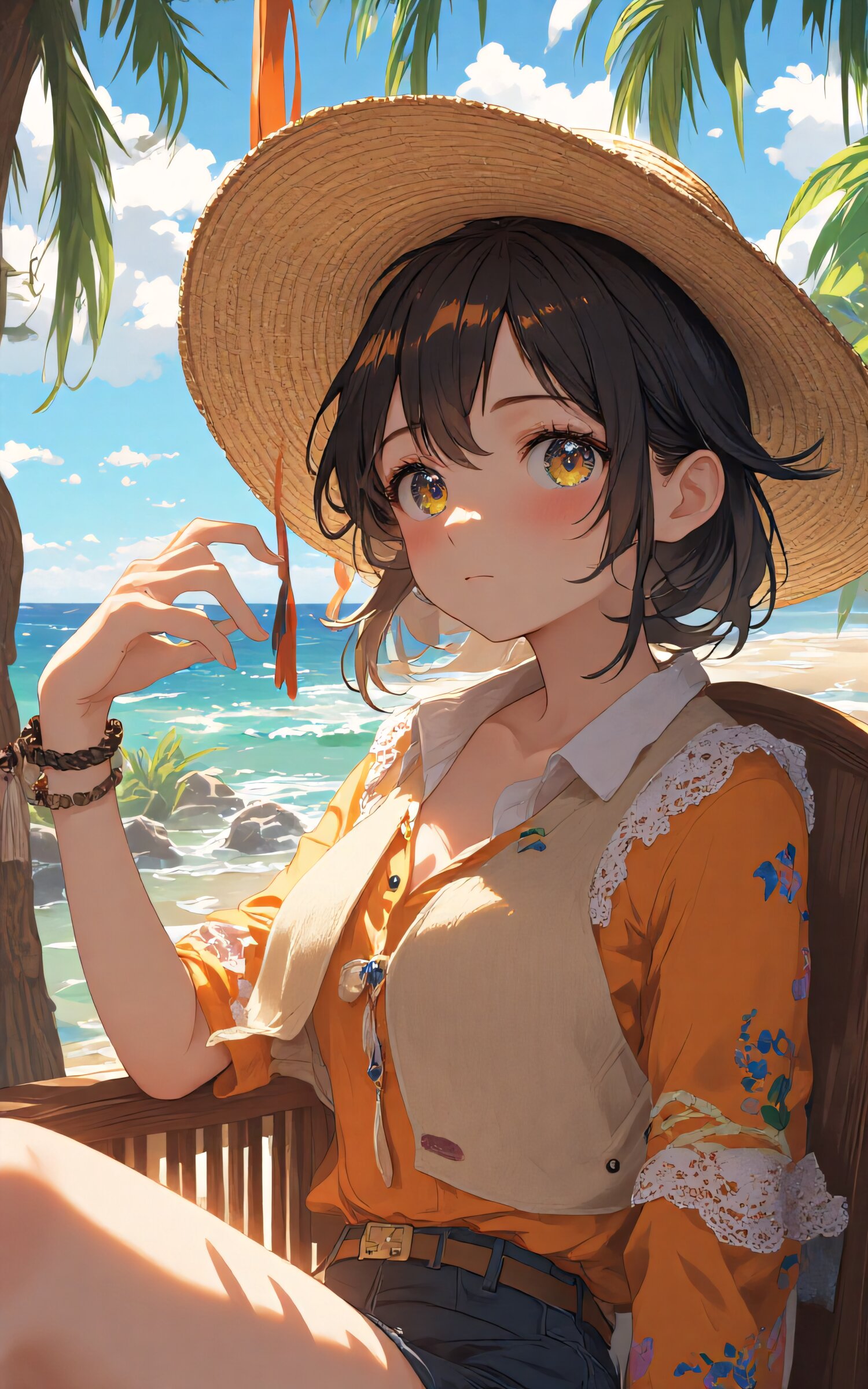 anime style, straw hat, ribbons , braided object, beige vest, lace accents, orange patterned shirt, nostalgic atmosphere, wooden furniture, sunlit , ocean setting, soft lighting, emotional depth, cinematic composition, ultra-detailed, masterpiece