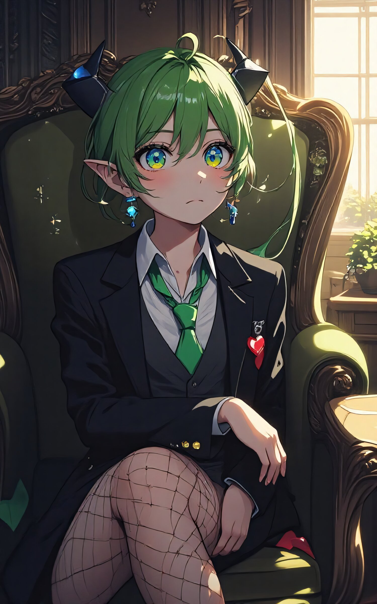 anime style, green hair, elf ears, , blue eyes, black suit, ahoge , white shirt, green tie, fishnet stockings, sitting on chair,, indifferent expression, earrings with blue beads and red heart, cozy interior, wooden paneling, window light, whimsical atmosphere, ultra-detailed, masterpiece