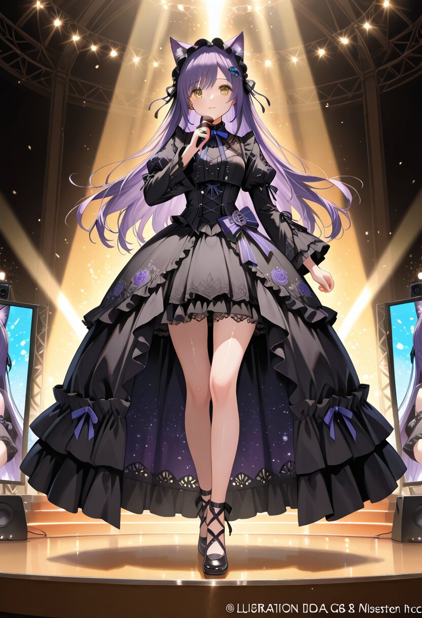 (masterpiece,high resolusion,illustration,ultra detailed 8k art,extremely detailed CG,official art,clothes reflecting light,detailed shiny skin,detailed background:1.3), ((highly detailed beautiful face and eyes)),anime style, full-body, long purple hair flowing elegantly, kemonomimi (animal ears), striking yellow eyes, wearing an intricate gothic lolita outfit adorned with lace, ribbons, and detailed embroidery, standing confidently on a grand stage, holding a microphone, dramatic stage lighting casting a mesmerizing glow, captivating idol presence, cinematic composition, visually stunning aesthetic