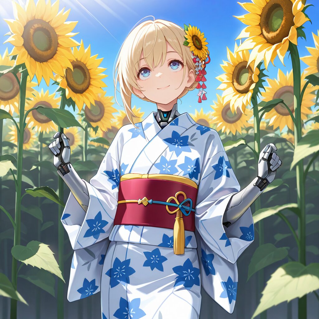 masterpiece,best quality,highres,highly detailed,8k,high resolution,high definition,general,1girl,solo,(cyborg,cyborg arms,cyborg hands,cyborg body,long yukata,sunflower patterned yukata,obi,flower hair ornament,kanzashi),smile,looking up,cowboy shot,sunflower,sunlight,blue sky,