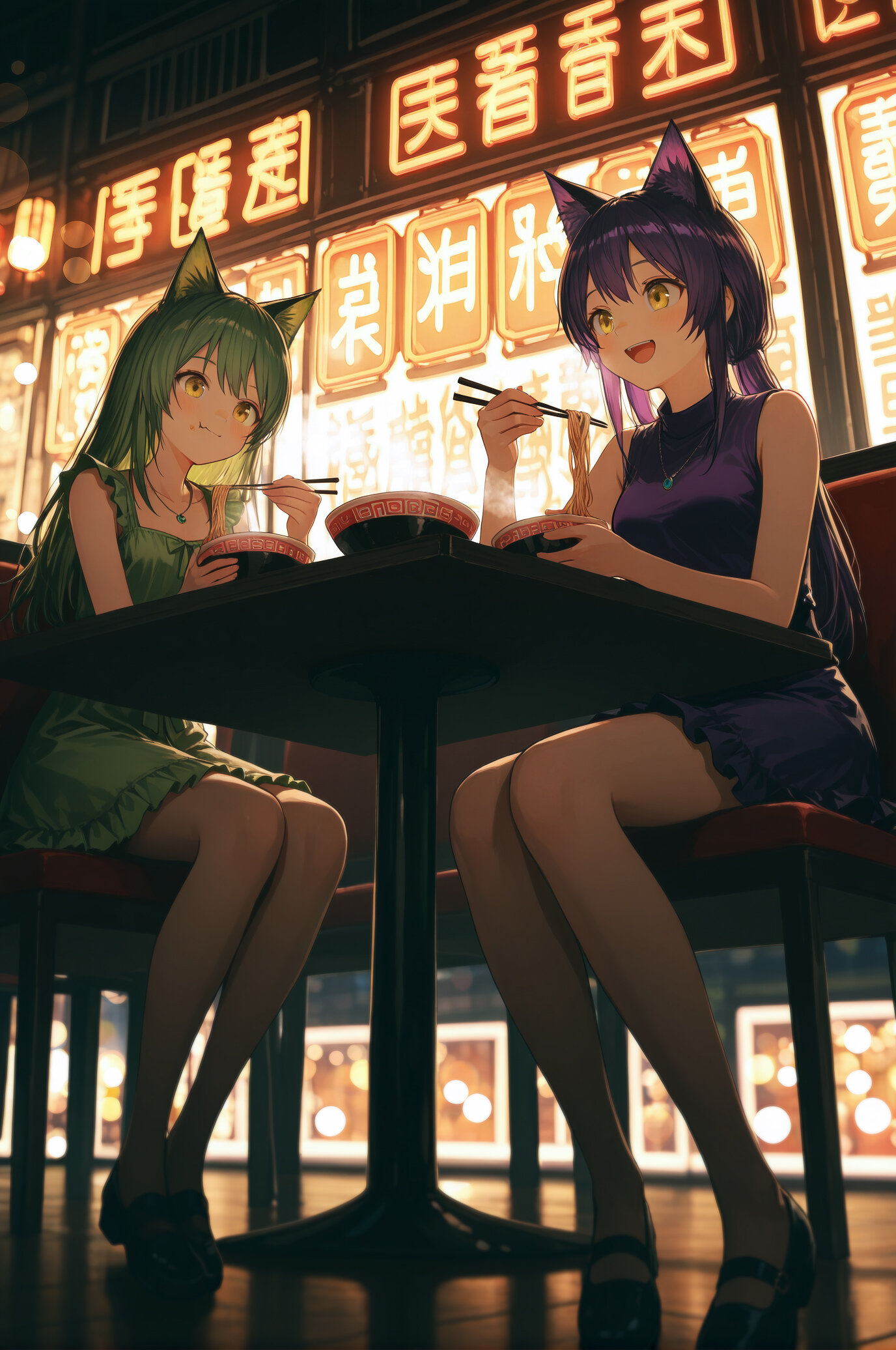 ライブ後に深夜ラーメン🍜を堪能するアメジストとフローライトの二人を生成しました!