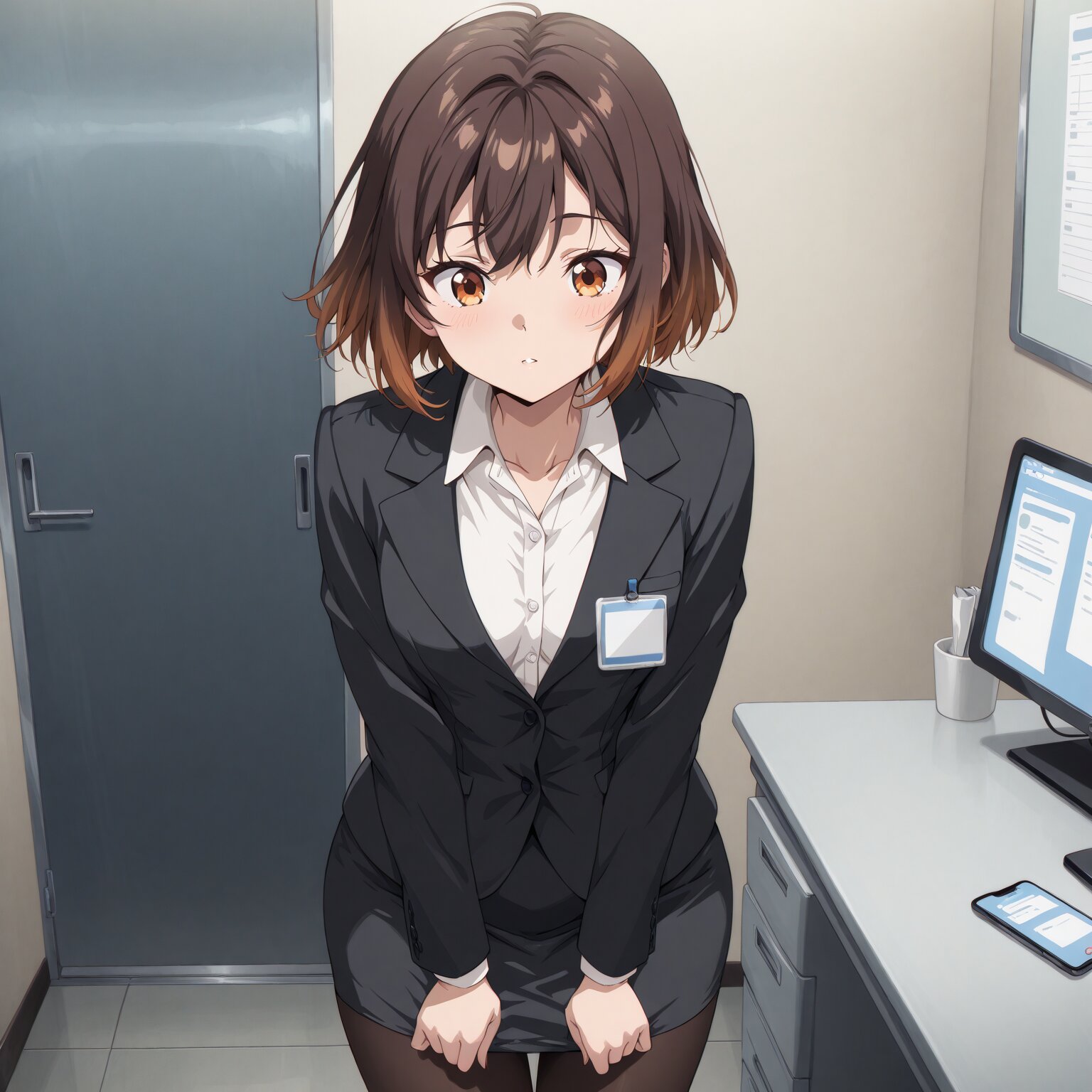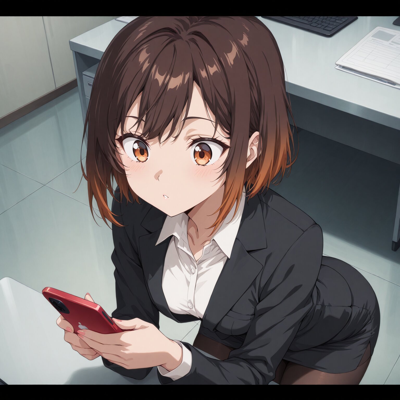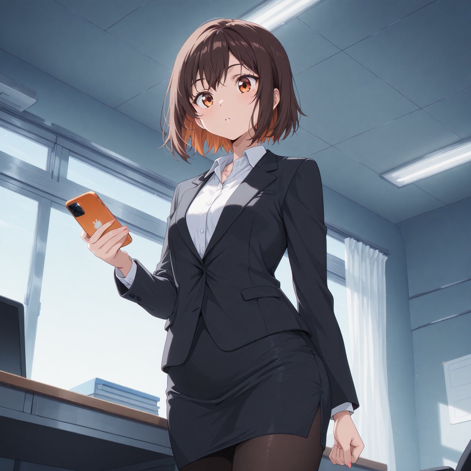 1girl, Dark brown hair, short hair, small breasts, orange eyes Office, desk, working Office lady, suit, jacket, shirt, skirt, black tights, Holding a smartphone BREAK, ((newest, year 2024, anime, animation, anime screen capture, anime style:1.3)) BREAK, ((masterpiece, , vibrant, very aesthetic, highly detailed, best quality, 16k:1.3)) Perfect hands, perfect fingers,