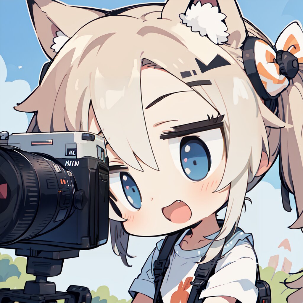 best quality, (empty eyes,looking at viewer:-1.0),(close-up,looking at another:1.1), solo,(chibi:1.4),twintails,wolf ears,:d,(holding camera:1.1),Nikon Zf, outdoors,street, <lora:fineline_v1:1.0>