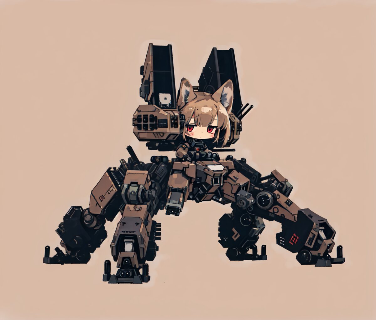 best quality, (mecha musume,cyborg,humanoid robot,exoskeleton,motorcycle:-1.0), (solo,1girl,chibi:1.2),cute,fennec ears,serious,(maneuvering mecha \\\(flegs\\\),on mecha,hexapod:1.1),non-humanoid robot,japan self-defense force,urban camouflage, (Maroon background:0.8), <lora:quadruped mechasV2:0.7:lbw=ALL:stop=10>, <lora:leco_spider_tank_v70c:-0.5:lbw=ALL:stop=10>, <lora:fineline_v1:1.0>