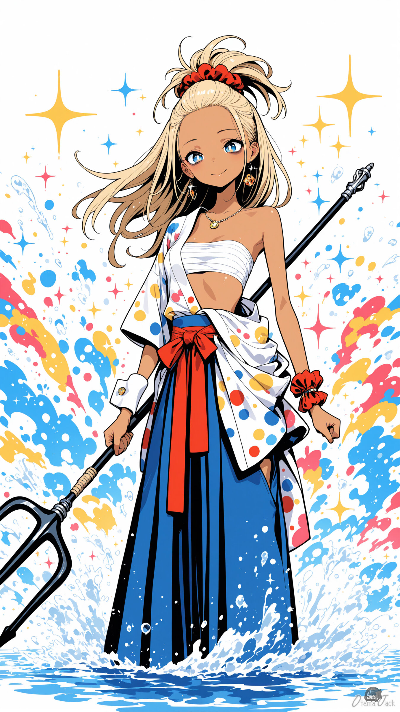 Blonde, long hair, bangs pinned back, blue eyes, dark skin, red scrunchie,(busty:1.2), japanese clothes, open clothes, kimono, bandages, hakama, sarashi, open kimono, chest sarashi, hadanugi dousa, bokken, iaidou,weapon, Japanese spear, holding Trident,