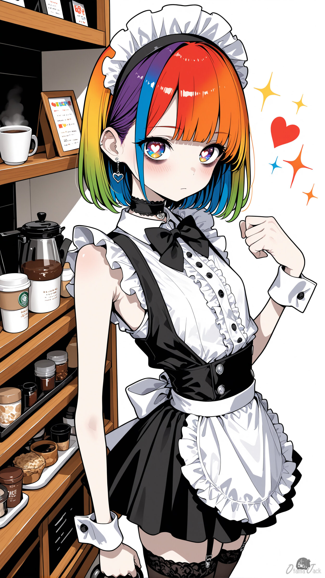 Rainbow colored hair, rainbow colored eyes, Seven colored hair, rainbow gradation shiny hair, short cut, diagonal bangs, straight hair, eyes without light, no emotions, thin body, flat chest, Short hair, BREAK welcome, hand up, palm, black bowtie, waitress,white shirt, apron, black skirt,maid choker,garter belt,stockings,Sleeveless,