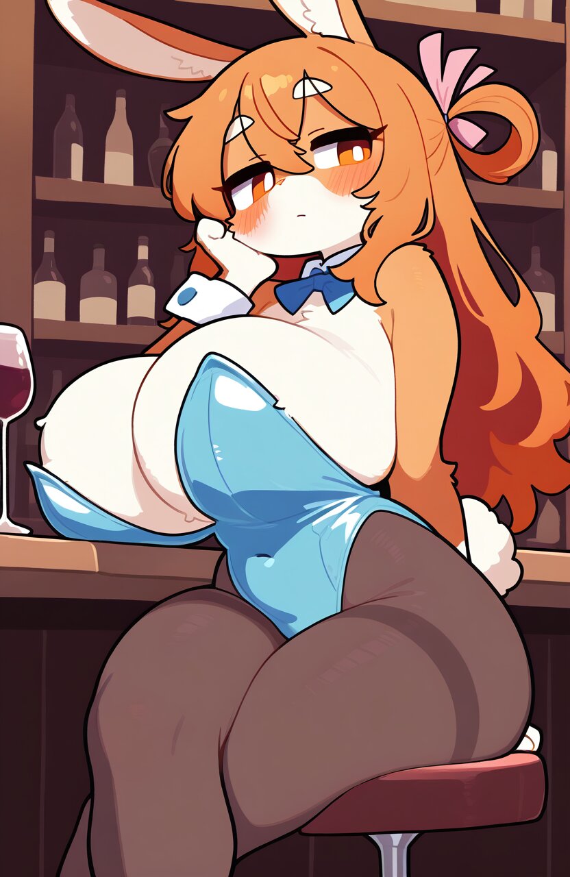 Bunny day,solo,short female,oppai loli,(rabbit girl),(furry female),orange fur,fluffy body fur,stand fur,orange rabbit ears,ears up,rabbit nose,orange rabbit tail,(gigantic breasts),sagging breasts,slim,covered navel,thick thighs,wide hips,orange hair,long hair,hair rings,pink ribbons,hair between eyes,orange eyes,no pupils,expressionless,unemotional,closed mouth,layering,blue tailcoat,separated leotard and pantyhose,cleavage,white detached collar,blue bow tie,playboy bunny costume,blue leotard,strapless leotard,sleeveless leotard,black pantyhose,thighband pantyhose,pantyhose under leotard,brown thigh boots,boots over pantyhose,wine glass,wine bottle,sitting on bar stool,crossed legs,hand on lap,head rest,arm rest,counter,head tilt,looking at viewer,sideways glance,from side,bar background,foreshortening,perspective,saturated,smooth,dramatic angle,looking at viewer,(low contrast:1.2),softy,(2D),(stylized),(kawaii),(cute),(anime coloring),furry,(two tone fur),(furry body),perfect body,detailed face,visible wide hips,high quality,cute clothes,animal tail,animal ears,solo,voluminous thighs,masterpiece,seductive mischievous expression,eductive demeanor,((correct_anatomy)),(detailed_hands:1.5),lolitaaa, girl, small body, short girl, petite, very short, tiny, cute,black pantyhose, flat color style, simple coloring style,Bright colors, Contour line, pale painting,flat color, no lineart