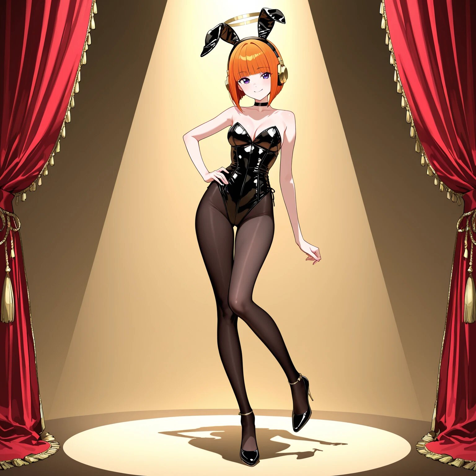 Anime style, full body, 8K Ultra HD, high detail, no watermark. A glamorous Japanese idol with short orange bob haircut and sleek pastel-gold headphones with subtle metallic accents. She wears a chic and alluring stage outfit: a glossy form-fitting corset bodysuit in deep black, paired with translucent dark tights and elegant stiletto heels. On her head, playful rabbit-like ears made of satin fabric, completing a sophisticated yet whimsical charm. 📸 Composition: A low-angle three-quarter shot as if captured from the audience’s perspective, emphasizing her confident yet graceful presence. The background is a softly blurred luxury stage with velvet curtains and a golden spotlight halo framing her silhouette. ✨ Lighting: Dramatic stage lighting—warm spotlights highlighting her curves, with subtle rim light creating a glowing outline along her hair and figure, enhancing depth and allure. 🤍 Pose: She stands with one leg slightly forward, hand resting on her hip, the other hand lifted delicately near her collarbone as if mid-performance. Her gaze meets the camera with a radiant, inviting smile, blending charm, elegance, and idol-like warmth.
