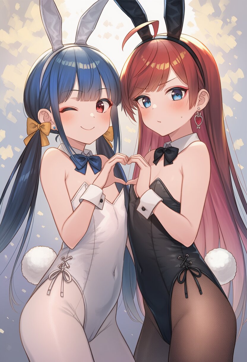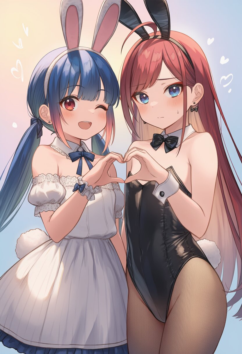 (Watercolor painting:9.0),soft brushstrokes,masterpiece,best quality,ultra detailed,2girl,simple background,girl,short stature,flat chest,red eyes,blunt bangs,{{cobalt Blue hair}},{pigtails},long hair,{{low twintails}},{{{extra long sideburns}}},Bunny girl,bunny ears headband,Smile, wink,heart hands duo,girl,standard height,flat chest,galizarin red hair,swept bangs,straight hair,{long hair},ahoge,turime,blue eyes,eyeshadow,earrings,Bunny girl,bunny ears headband,Embarrassing,heart hands duo,