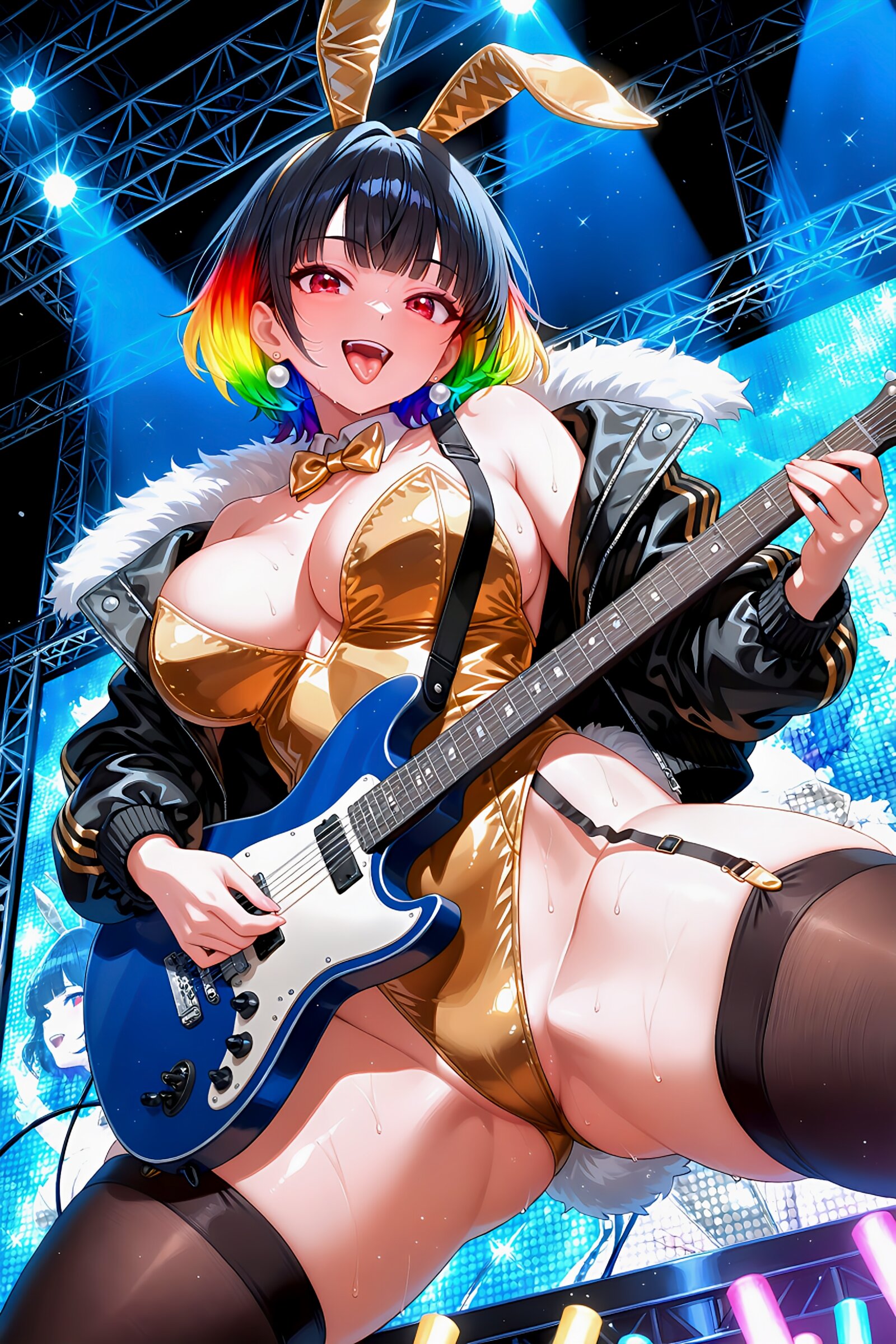 dutch angle,night,cowboy shot,1girl, smile,open mouth,sweat,motion blur,spread legs,dynamic pose, black hair,rainbow hair, large breasts,red eyes,Pearl earring,bunny girl,gold bunny suit,satin gold leotard,garter straps,black kneehighs,black sci-fi jacket,gold bunny ears,white choker and gold Bow tie,fluffy bunny tail, anime style,high resolution, more details, 8k quality ,((4k,8k,Ultra HD)),((Masterpiece :1.2)),((Best quality :1.2)),((Detailed :1.5)),((Detailed background :1.5)), electric guitar, concert, audience, tongue out,from below, music, bantu knots,choppy bangs,