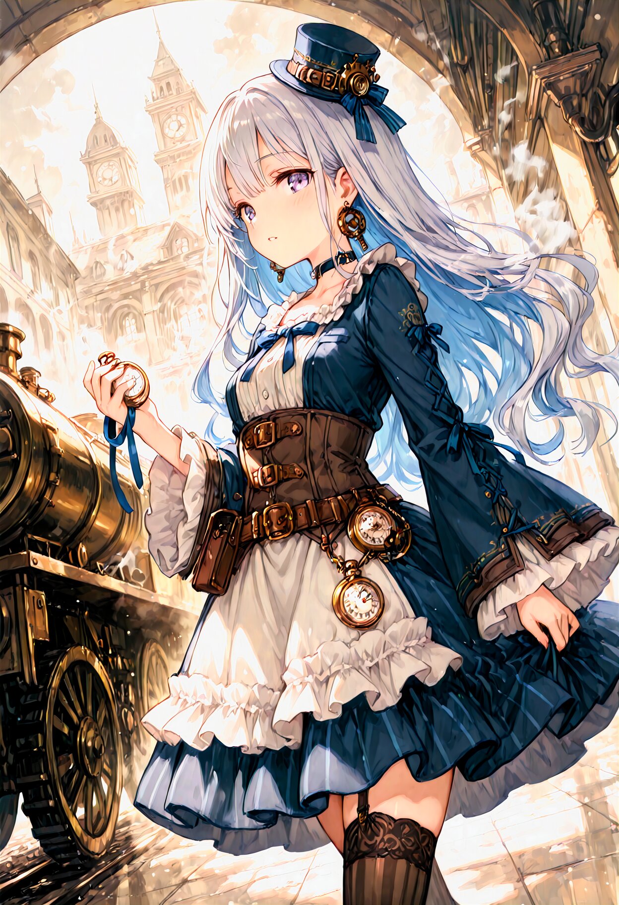 beautiful detailed background, best quality, (pale color:0.9), sepia theme, (steampunk,:1.1) (steam locomotive,:1.1) pocket watch,holding pocket watch, station, Station terminal,steam , clock tower, parted lips,(Expressionless:0.8), big eyes,(half-closed eyes,:0.9) tareme, pale purple eyes, thighhighs, (silver hair:1.1), (dark blue hair colored inner hair:0.8), long hair,wavy hair, eyebrows visible through hair, gear. mini hat, earrings, jewelry, frills, belt, long sleeves, white and darkblue two-tone dress, wide sleeves, striped, blue strapping ribbon and bow, frills, strapping ribbon, choker, temptation, goggles, profile, walking, dutch angle, (looking at viewer,:0.9) <lora:sdxl2-flat2-512b:-1.2> <lora:noline-16oa:-0.3>