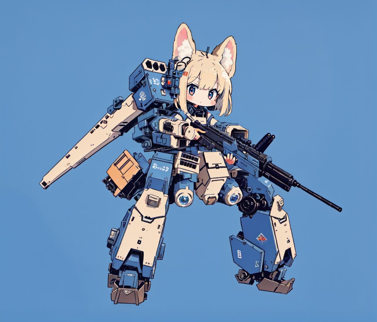 masterpiece,best quality, (mecha musume,cyborg,humanoid robot,exoskeleton,motorcycle:-1.0), (solo,1girl,chibi:1.2),cute,fennec ears,serious, (maneuvering mecha \\\(flegs\\\),on mecha,hexapod:1.1),non-humanoid robot,japan self-defense force,rocket launcher, (blue background:0.8), <lora:quadruped mechasV2:0.7:lbw=ALL:stop=10>, <lora:leco_spider_tank_v70c:-0.5:lbw=ALL:stop=10>, <lora:fineline_v1:1.0>