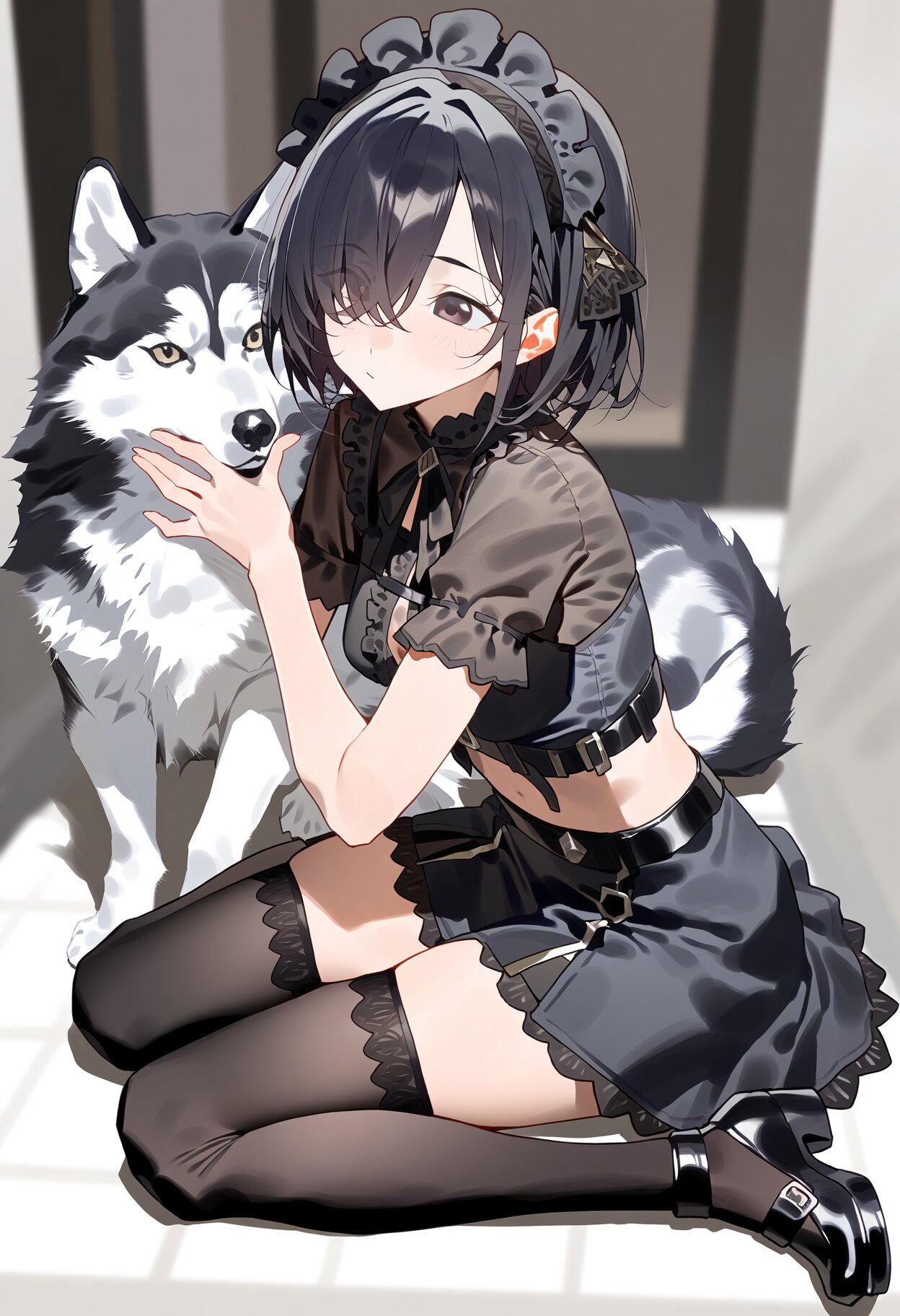 hair over one eye、aroused、early teen、dark skin、solo、black hair、short hair、tareme、1girl、blurry background、Black head dress, black frilly short-sleeved blouse, black frilly miniskirt, black thigh-high socks, absolute territory, black leather shoes, zettai ryouiki,