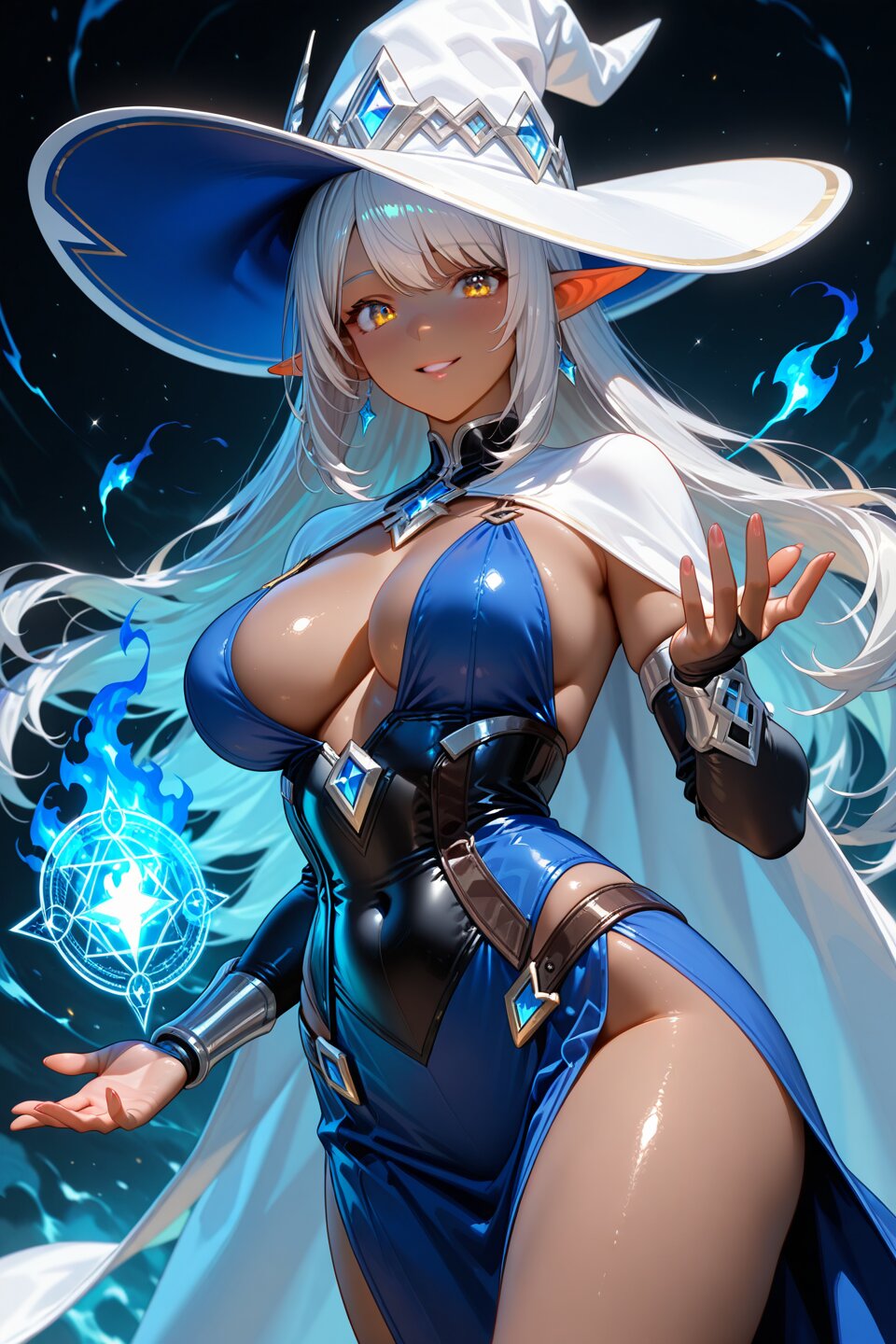 moe heroine, unity engine, fantasy:1.4. sfw:1.2, rating:general, very aesthetic, fine detail, Pure image, nice hands, perfect hands, perfect anatomy, perfect structure, fantasy, lot of magic circle effect around her, cowboy shot, dynamic angle, dynamic pose, Burning magical fire effect. (1girl, solo), The girl is wears is female Mage costume and wide-brimmed hat with Mischievous Smile. beautiful eyes, ultra detailed lips, Elegant, Graceful. dark elf woman, golden eyes, (dark skin:1.4), dark-skinned female:1.4, (shine silver hair:1.3),, masterpiece, amazing quality, very aesthetic, high resolution, ultra-detailed, absolute, newest, 2d, semi-realistic, moe heroine, sharp focus,