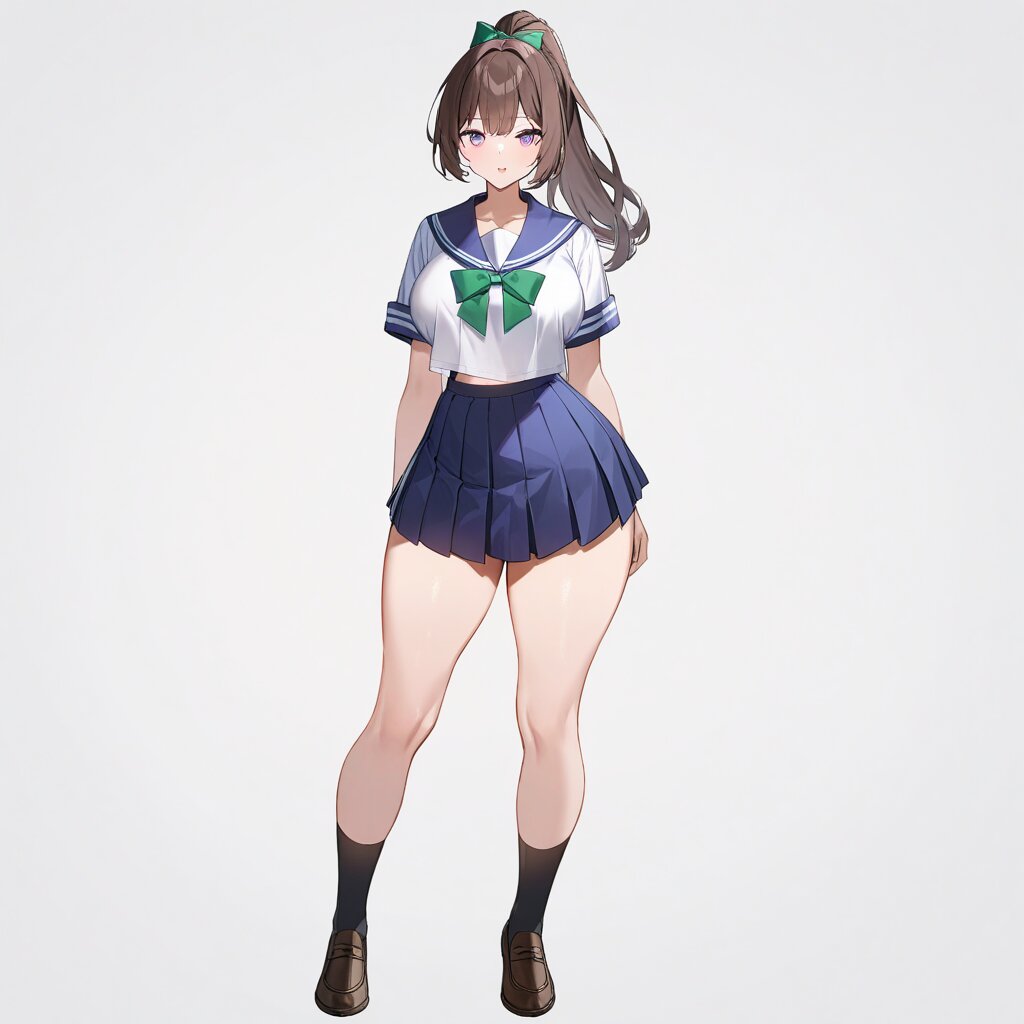 masterpiece, best quality, high quality, highres, (emerald green ribbon),dark brown hair, high ponytail, medium bangs ,violet eyes,large breasts, slim body,undersized,shiny skin, BREAK,school uniform, sailor uniform with a light purple blue sailor collar and white stripe, short sleeved ,light blue purple mini pleated skirt,yellow bow, BREAK,black socks,brown Loafer,full body, ,White background,