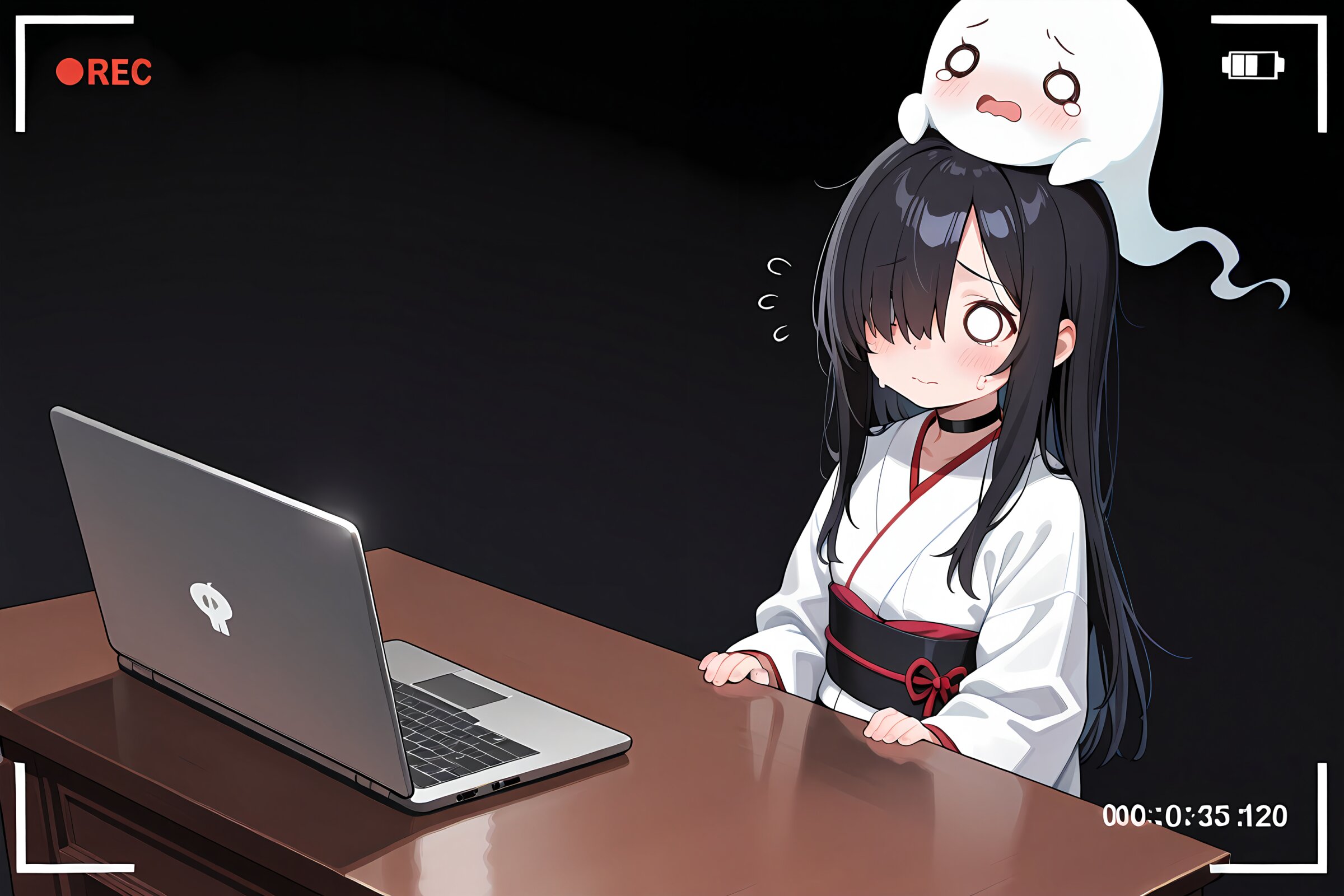 1 little girl, solo, diagonal angle, masterpiece, best quality, amazing quality, very aesthetic, black hair, long hair, (hair over one eye:1.2), o o, nervous, nervous sweating, flying sweatdrops, choker, white kimono, standing, laptop, podium, ghost on head, viewfinder, recording, in studio,