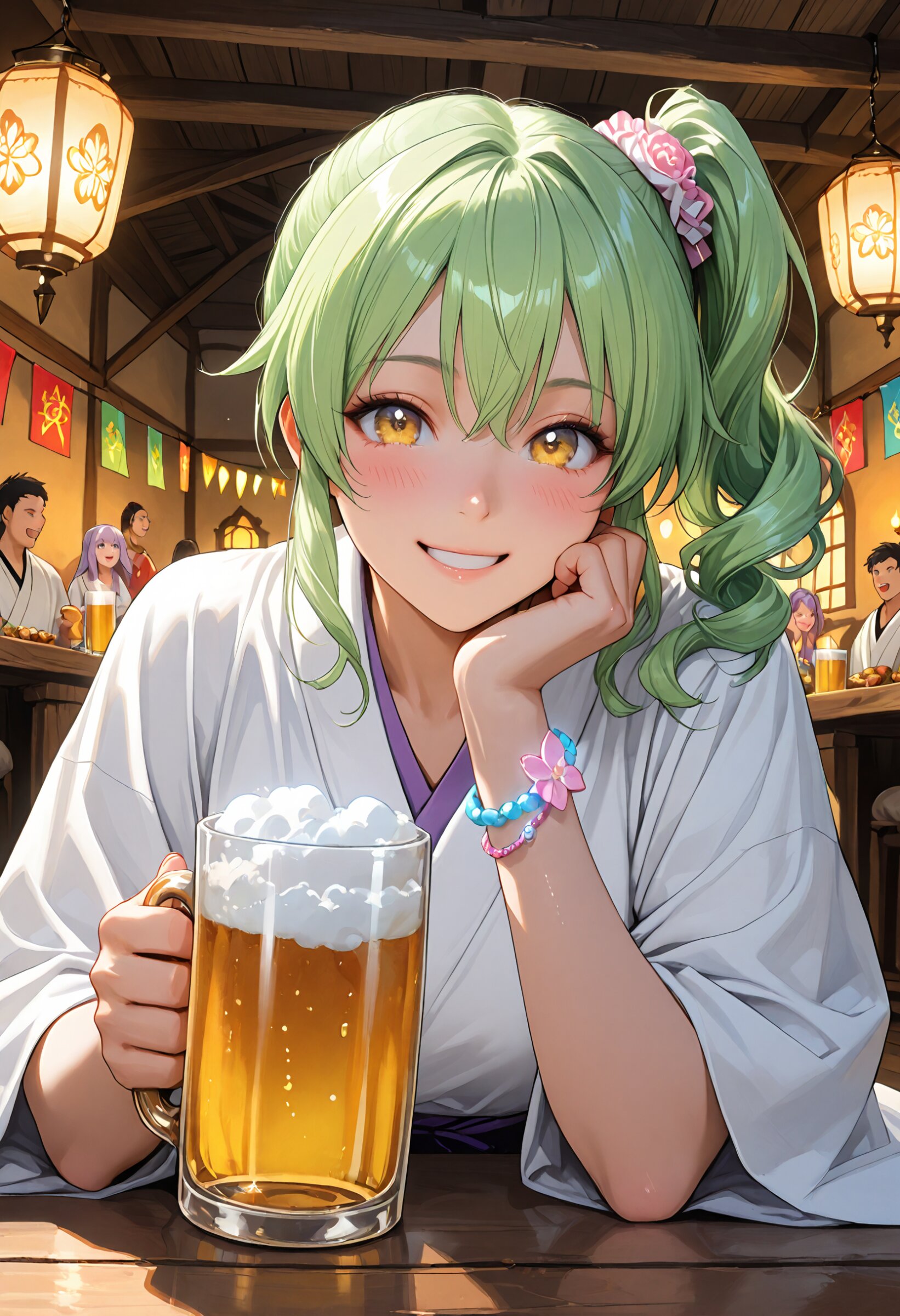 masterpiece, best quality, ultra-detailed, vivid colors, HDR, glossy, close-up portrait of a beautiful anime girl with long green hair with light purple highlights, styled in a side ponytail, golden eyes, wearing a pure white robe, smiling brightly while raising a large transparent glass beer mug, detailed handle, filled with golden beer and frothy foam, realistic glass reflections, her wrist showing a glowing cyan magical bracelet, background of a lively fantasy tavern celebration, adventurers cheering and raising their own mugs, colorful banners and glowing lanterns, festive joyful mood