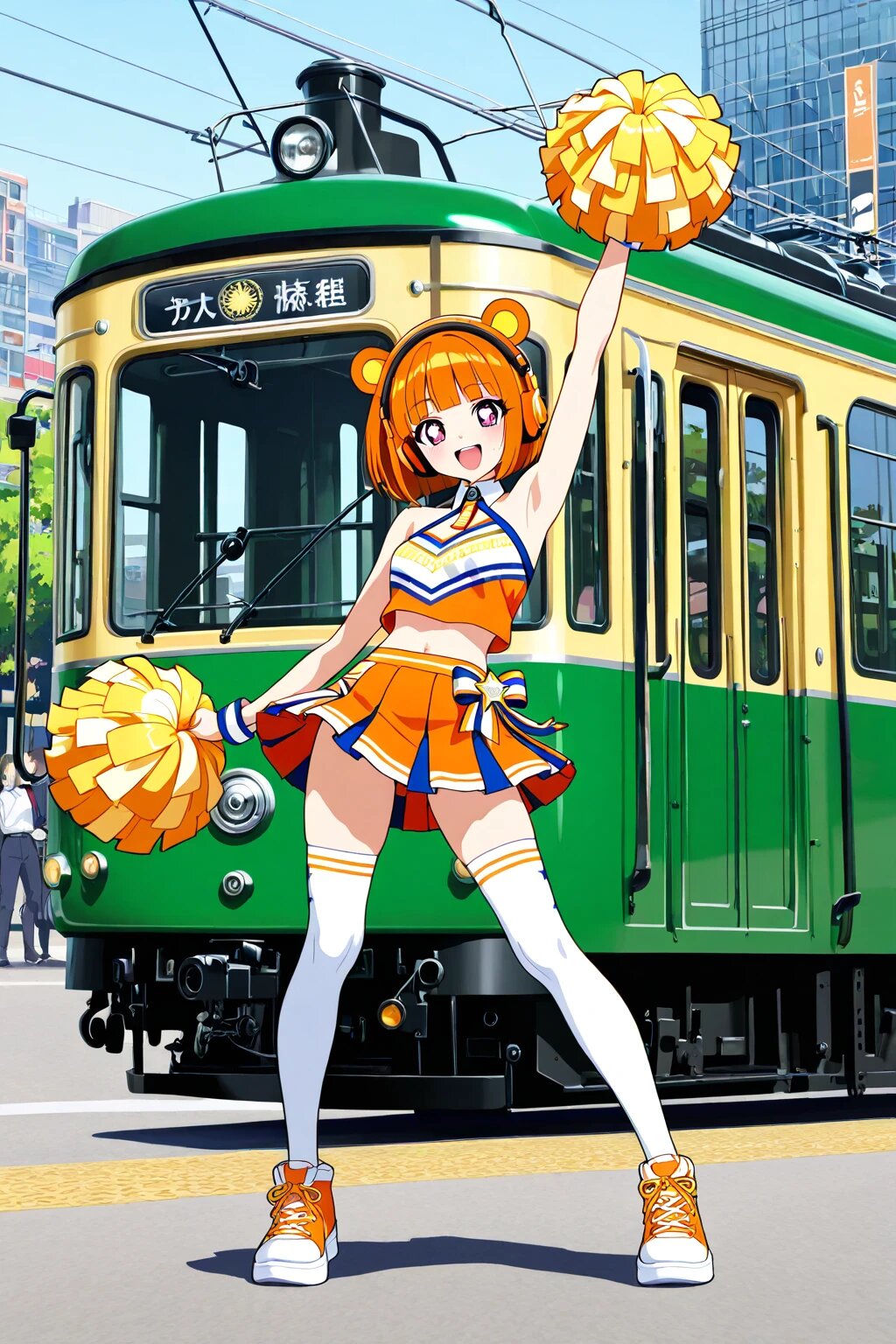 > Anime style, ultra high resolution, no watermark. A full-body, dynamic promotional portrait of a Japanese idol styled as a cheerful cheerleader. Captured from the perspective of a professional photographer during an outdoor photoshoot. She has bright orange bob-cut hair and distinctive orange headphones with small monkey ears, symbolizing her “Year of the Monkey” role. Her outfit is a vivid idol-style cheerleader uniform: a sleeveless open-shoulder top in white and orange with pink accents, paired with a pleated orange skirt trimmed with glittering ribbons. The fabric features shimmering, semi-sheer panels that sparkle under natural daylight. She holds a pair of fluffy, metallic orange-pink pom-poms, catching highlights in the sun. She wears white knee-high socks and orange-pink platform sneakers, maintaining her idol-brand aesthetic while enhancing the cheerleader energy. Her expression is bright and radiant, with a big smile, eyes sparkling with excitement. The background features a green Japanese streetcar (chinchin densha) in soft focus, suggesting a local city setting. The train’s classic retro design adds authenticity and nostalgia to the scene. Street elements like tracks, signs, and faint greenery are subtly blurred, keeping Zena as the crisp focal point. Lighting is professional and cinematic: a natural backlit glow from the afternoon sun, with reflectors providing soft fill light on her face and outfit. Her pose is lively yet controlled, one arm raised with a pom-pom, the other at her hip — dynamic enough to show cheer spirit but composed for group lineup photos. The overall mood blends idol cuteness, cheerleader energy, and the authentic charm of a Japanese city street with its green streetcar, captured like a polished magazine photoshoot.