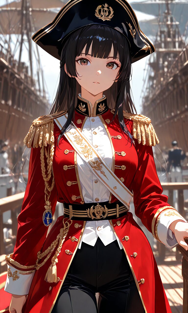 1 lady,long hair, black hair, blunt bangs, (classical navy ship),bicorne, black hat, black pants, epaulettes, long sleeves, military uniform, naval uniform, red coat, royal navy, shoulder sash, white shirt