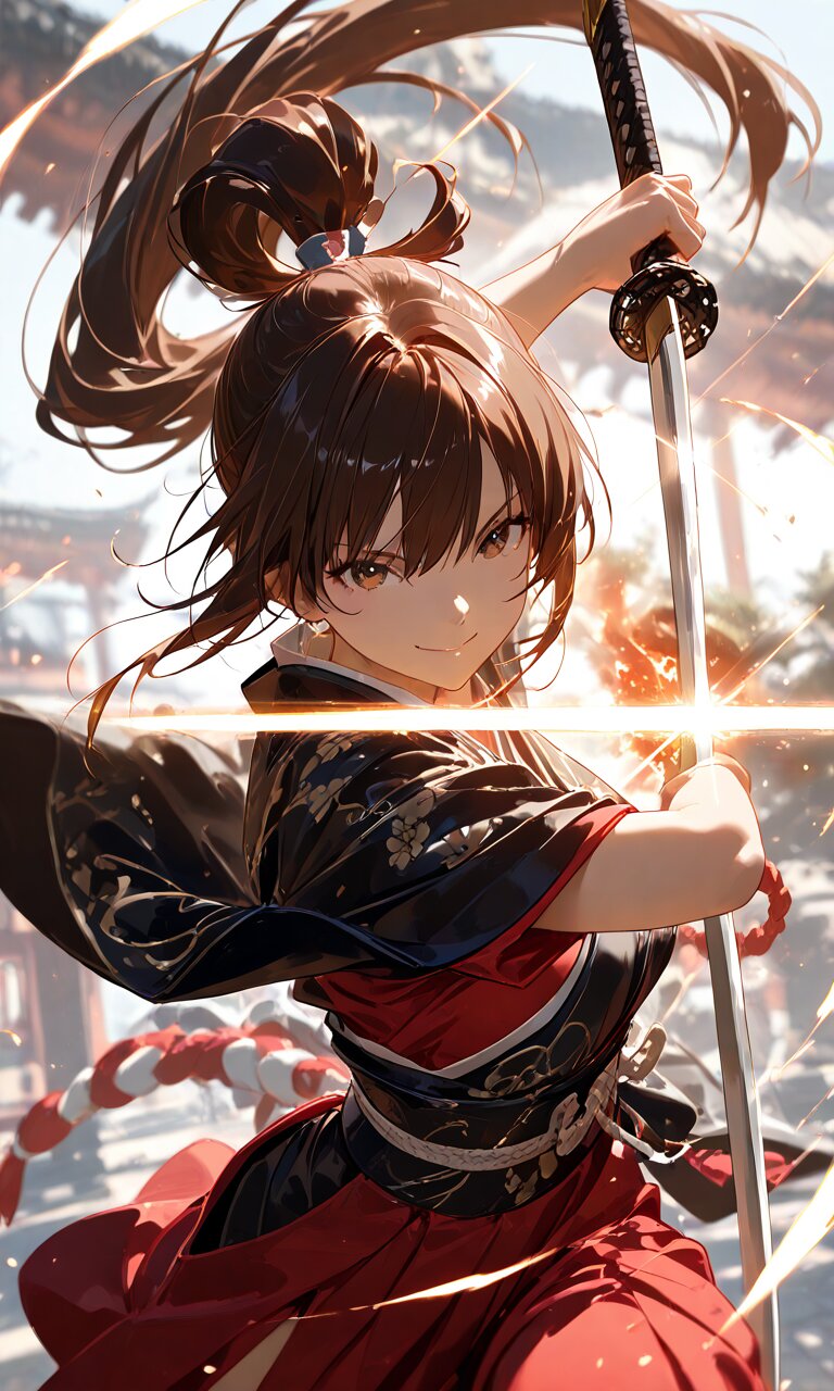 1 lady, brown hair, long hair, ong ponytail, smile, Japanese cloth, (holding sword), fighting