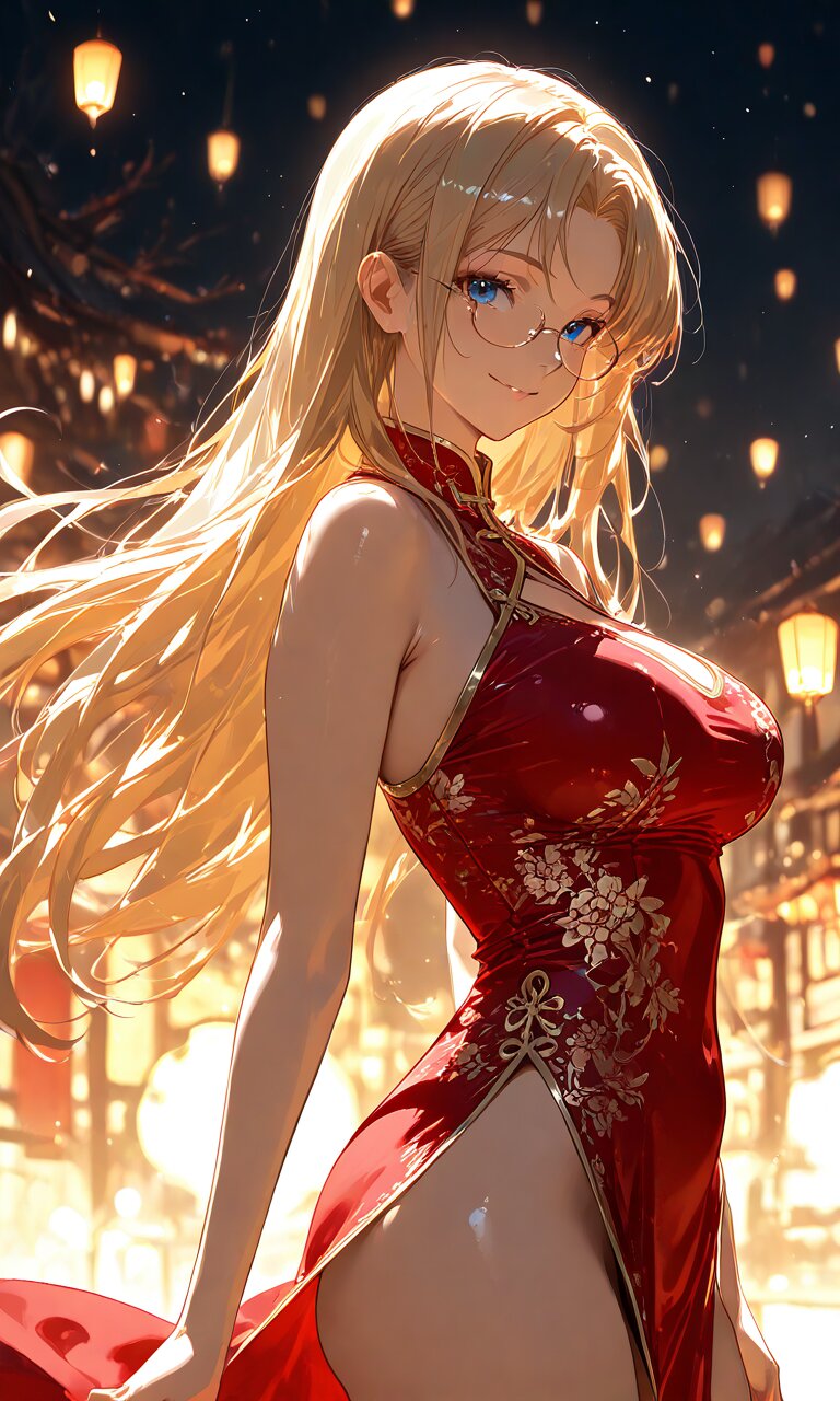 1 lady, blue eyes, long hair, , blonde hair, smile, glasses,, big breasts,(red cloth, china dress), side view, cowboy shot, looking at viewer,
