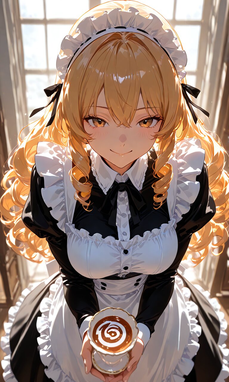 (best quality),(masterpiece),(ultra detailed),1 lady, long hair, blonde hair, smile, spiral curls, maid, (panic, anxious), ((broken teacup))