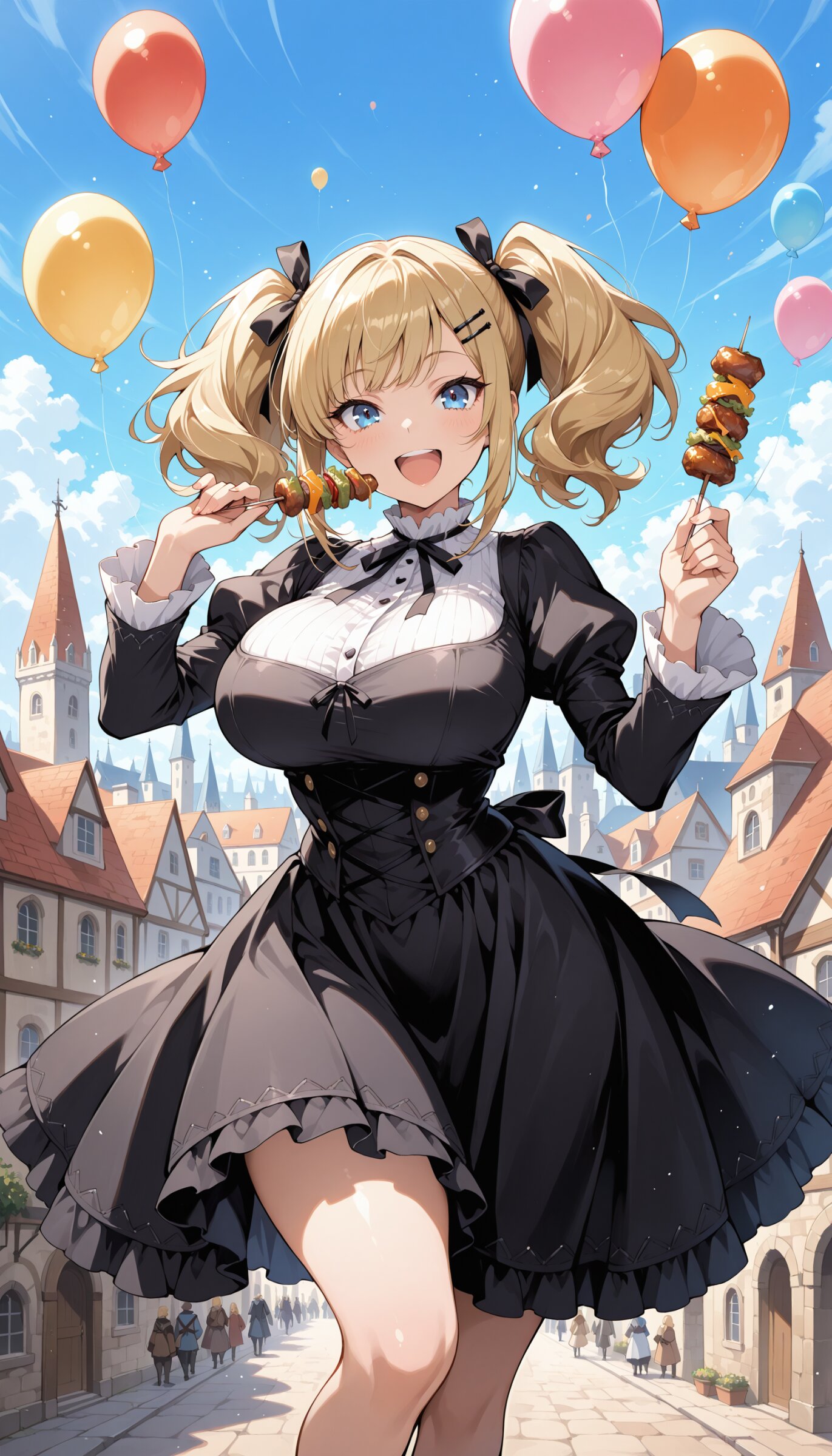 masterpiece,best quality,amazing quality,general, fine detail, official art,light particles,1girl,eating kebab,curvy,solo,;D,blonde hair,twin tails,high twin tails,short twintails,black hairpin,big hair,black ribbon,bangs covering eyebrows,sidelocks,blue eyes,small eyes,(tsurime:1.1),long eyelashes,big breasts,Gothic dress,outdoors,ens_flare,many Balloons are flying,wide shot,medieval fantasy cityscape,happy expression,joyful,delighted,cheerful,