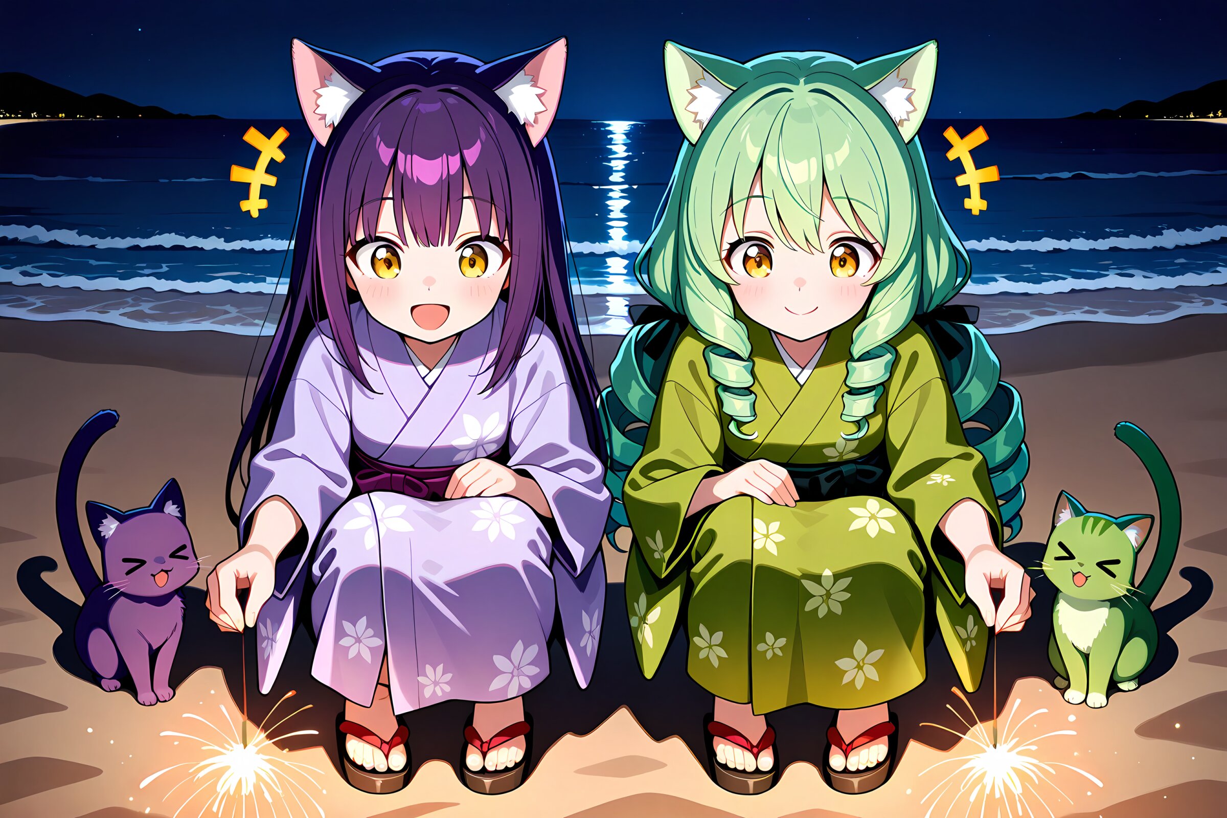 2 little girls, solo, symmetrical pose, masterpiece, best quality, amazing quality, very aesthetic, purple hair, long hair, straight hair, yellow eyes, (purple cat ears:1.2), open mouth, smile, cheerful, +++, notice lines, purple yukata, senkou hanabi, holding japanese sparkler, squatting, purple cat, > <, night, ocean, sand beach, BREAK 2 little girls, solo, symmetrical pose, masterpiece, best quality, amazing quality, very aesthetic, green hair, (long hair:1.2), low twintails, ringlets, quad drills, drill sidelocks, yellow eyes, (green cat ears:1.2), black ribbon, closed mouth, smile, cheerful, +++, notice lines, green yukata, senkou hanabi, holding japanese sparkler, squatting, green cat, > <, night, ocean, sand beach,