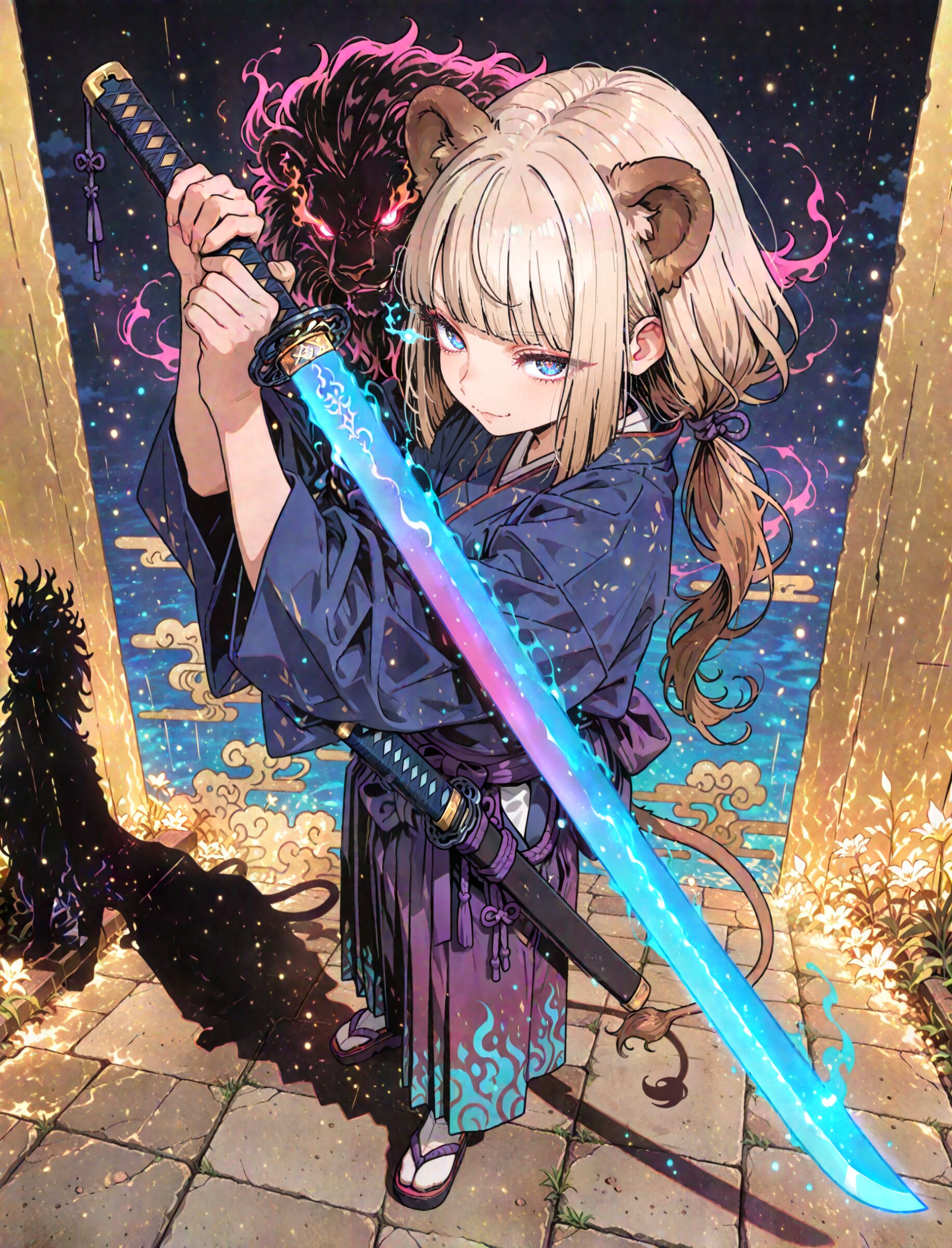 super fine concept art, hard surface, 8K, masterpiece, best quality, amazing quality, very aesthetic, absurdres, straight-on, (close to viewer:1.2), knees out of frame (from above,looking up:1.0) , (dutch angle:1.2), weapon focus The silhouette is composed of dynamic, argyle and vibrant prism. The background is a solid, creating a striking contrast with the intricate, multi-colored design of the character, summer atmosphere. glowing lion energy, burgundy silhouette of serious lion guardian, huge lion aura, 1boy, samurai, (muscular male:0.8), beige hair, hazel brown colored tips, low tied hair, diagonal bangs kinky hair, flaming eye, eye trail, beautiful light blue eyes, ,, lion ears, lion tail, (holding Japanese gentian blue sword:1.3), scabbard, (swirling pattern kimono:1.0), , egasumi, sandals, tabi, (naughty face,seductive smile:1.0), , dynamic pose, kung fu attack, kung fu action (swirling ink effects:1.2) chasing, beautiful metallic luster, sharp katana, ultra detailed katana, silver particles, light trail, The background is a solid, bright burgundy, creating a striking contrast with the intricate, multi-colored design of the character, (standing silhouette:1.0), pop color background, (high saturation:1.2), summer coloring, partly black ink wash effect, burgundy drop shadow, professional art lots of details, , overexposure, sumie effect style, 4ur4_illu,shiny, glowing, glowing particles, glowing light particles, light particles, burgundy crystal, <lora:noline (1):-0.5> <lora:sdxl2-flat2-512b:-0.2> <lora:facelightup_xl_v10:0.5> <lora:V2_yakumo_alchemy:0.5> <lora:Aura_illu:0.1>
