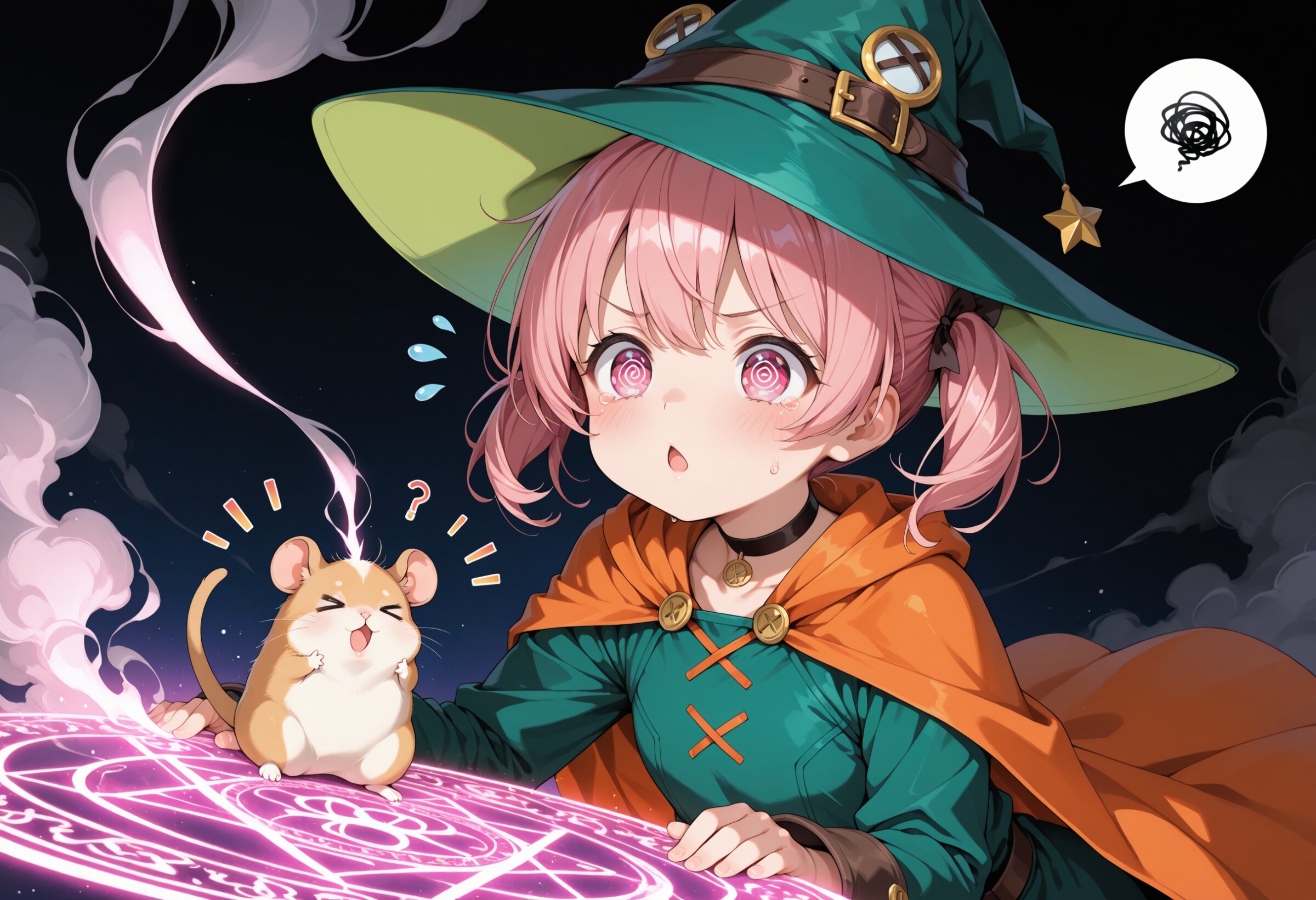 1 little girl, 10yo, solo, diagonal angle, upper body, masterpiece, best quality, amazing quality, very aesthetic, pink hair, twintails, pink eyes, @_@, chestnut mouth, tearful, confused, troubled, angry, sweat, flying sweatdrops, shout lines, spoken squiggle, choker, choker, green hunter outfit, long sleeves, orange cape, green witch hat, (hamsters:1.2), magic circle, > <, magic light, magic effect, smoke, magic labo,