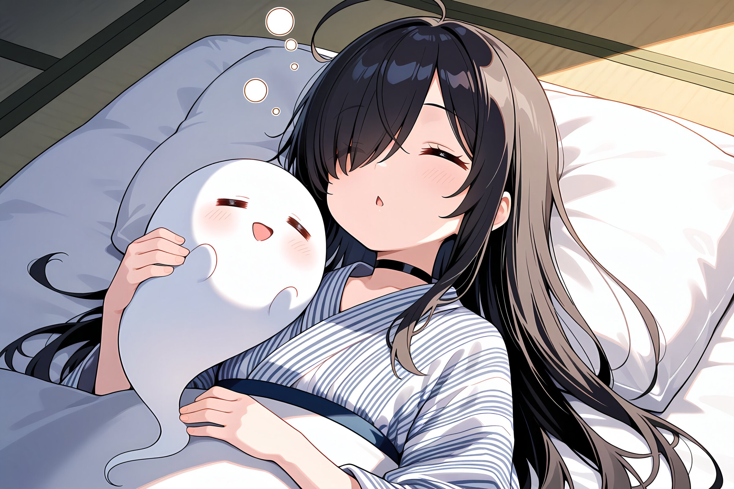 1 little girl, solo, upper body, diagonal angle, masterpiece, best quality, amazing quality, very aesthetic, black hair, long hair, ahoge, (hair over one eye:1.2), closed eyes, =_=, chestnut mouth, smile, mouth, cheerful, relaxing, Squeans, spoken Squeans, choker, yukata, lying, sleeping, holding ghost, =_=, futon, morning,