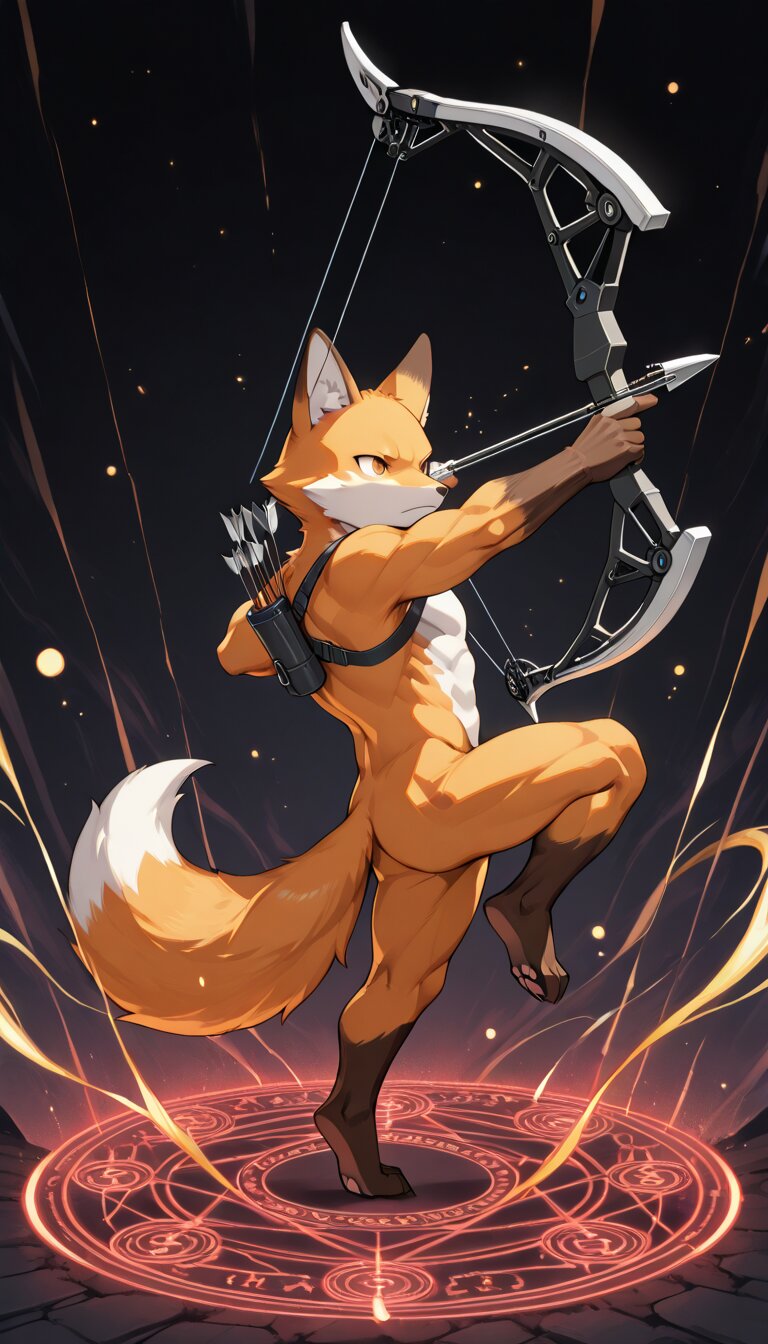chibi, 1 furry, solo ,fox, (no human:1.6), (Magic circles:1.2), many magic circles,There is a magic circle on his back and magic circles around his body. cute,serious, Fantasy, Chariots,on Chariots, (compound bow:1.3), bow, holding bow, knee up, weapon, dynamic_pose, aiming,from side, Muscular, handsome,