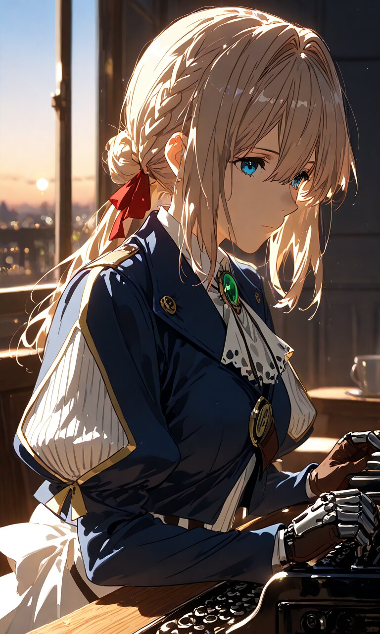 1 lady, mechanical hand, using typewriter, side view, evening, sitting, looking away, ,violet evergarden,1girl,solo,hair between eyes,long hair,long sleeves,shirt,bangs,looking at viewer,collared_shirt, hair intakes,closed mouth, hair ribbon,brown gloves,blue jacket,jacket,jewelry,white ascot,puffy sleeves