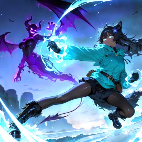 (anime-style illustration:1.5), (2girls:1.2), (Light green hair:1.2), (dark purple hair:1.2), (yellow eyes:1.2), (cat ears:1.2), laugh, enjoy, smile+happy (whitening), (long hair), (hime cut), (shiny hair), (drill hair), idol, cleavage, (Light blue pastel sweet Lolita:1.5), (purple pastel sweet Lolita:1.5), (hair band:1.2), (frilled dress), mini skirt, frilled socks, lace platform boots, choker, bracelet,