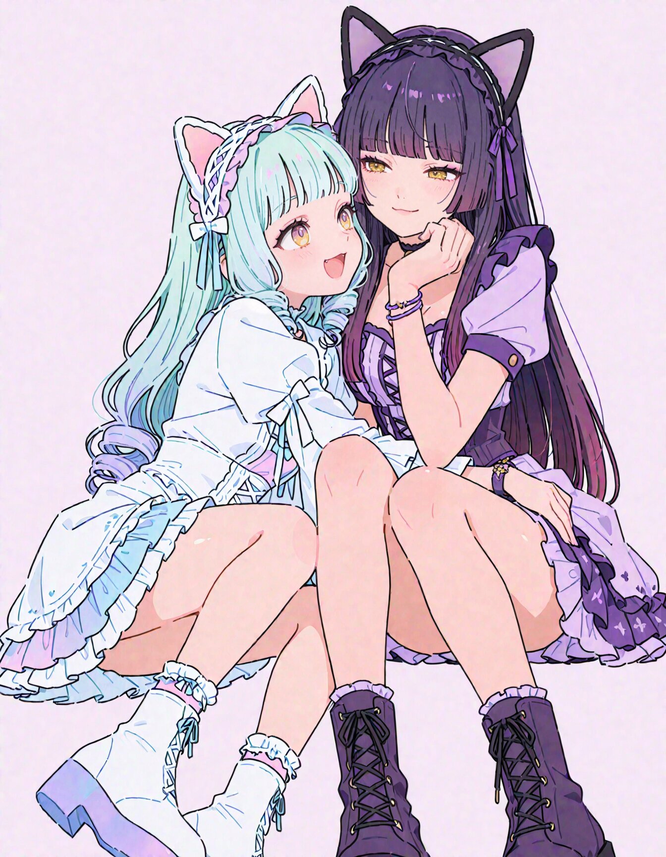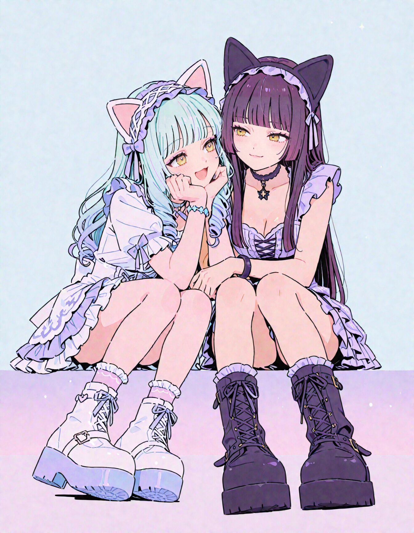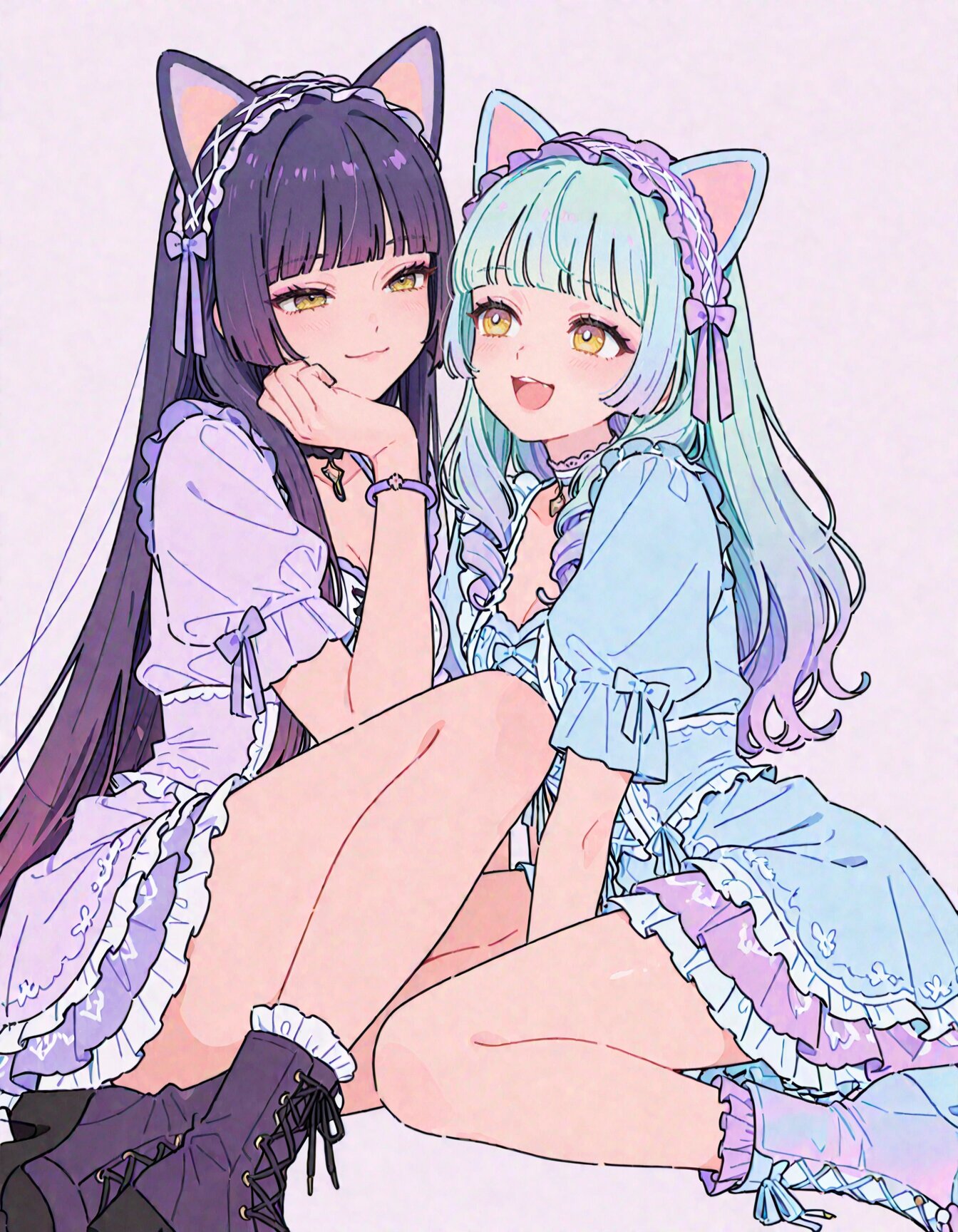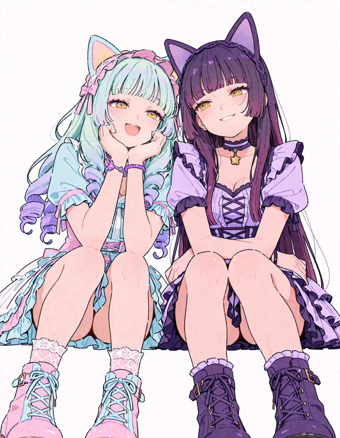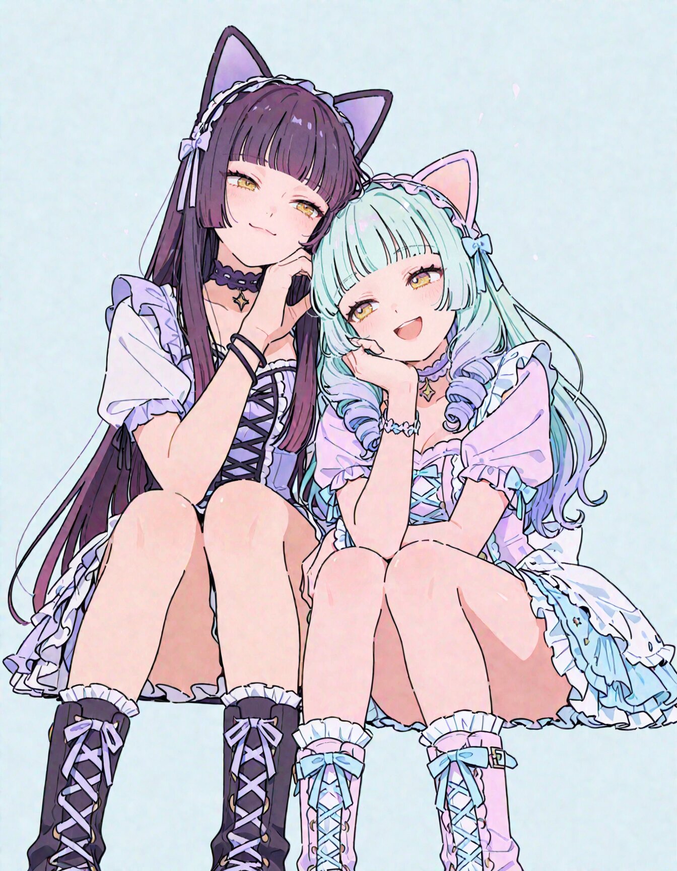 (anime-style illustration:1.5), (2girls:1.2), (Light green hair:1.2), (dark purple hair:1.2), (yellow eyes:1.2), (cat ears:1.2), laugh, enjoy, smile+happy (whitening), (long hair), (hime cut), (shiny hair), (drill hair), idol, cleavage, (Light blue pastel sweet Lolita:1.5), (purple pastel sweet Lolita:1.5), (hair band:1.2), (frilled dress), mini skirt, frilled socks, lace platform boots, choker, bracelet,
