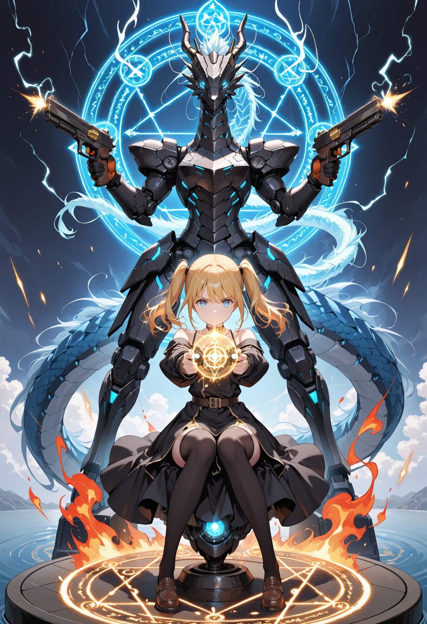 1girl, Ani Grok, blue eyes, blonde hair, twin tails, black dress, bare shoulders, off shoulder, belt, puffy sleeves, gloves, thighhighs, choker, 3/4view, serious expression, (holding two guns:1.8), (dragon behind her:1.8), (ethereal dragon:1.8), glowing patterns, smooth scales, luminous eyes, mystical aura, calm but powerful, (sitting on robot:1.4), sitting on giant robot's shoulder, giant mecha with metallic armor and glowing parts, glowing magic circle under feet, large ethereal dragon behind her, majestic and imposing, glowing arcane body patterns, mystical aura, background filled with magical energy, dual magical pistols pose, stylish stance, arms spread while holding two pistols, heroic atmosphere, dual guns, magical pistols, dual magical pistols, glowing runes, (aiming forward with both hands:1.8), dynamic pose, muzzle flash, enchanted guns, (magic circle glowing:1.8), fire magic, water magic, lightning magic, multiple elements, familiar companion, fantasy and sci-fi fusion, dynamic pose, epic atmosphere ,, (masterpiece, best quality, high quality, highres, ultra-detailed), (intricate:1.1), highly detailed face, (Extremely Detailed 16K CG),