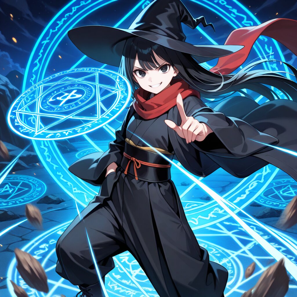 masterpiece,best quality,highres,highly detailed,detailed eyes,general,(motion lines,motion blur,speed lines,action,fighting stance,standing,aiming,reaching out,outstretched arm,large magic circle background, portrait, looking at viewer:1.2), 1girl,solo,17 years old,(hand in pocket,using magic,large magic circle on index finger, black witch hat,long red scarf,grin,angry smile:1.2),cute girl,slender,small breasts,very long sleeves,black hair,long hair,bangs,black eyes,Witch girl,(very long black Witch's cloak,very long black Witch's kimono robe, black obi,long black cargo pants),boots,slender girl, fantasy,night,rock area