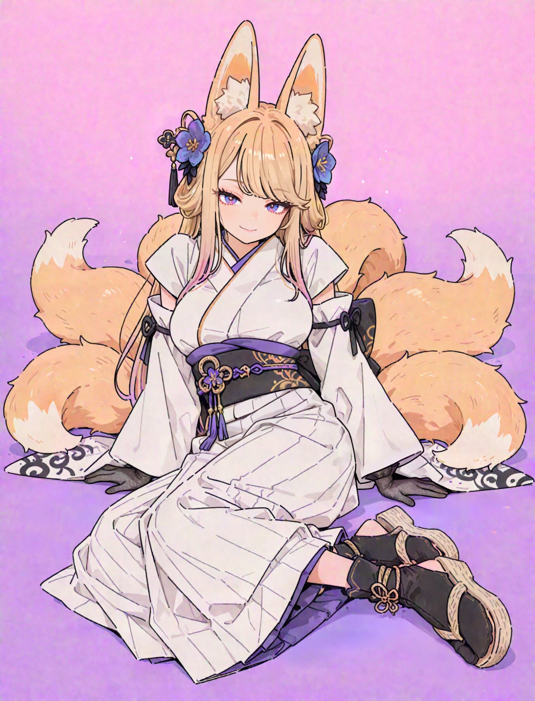 from front, (high angle shot:1.1), (face:1.2), , looking at viewer, (simple pastel color background:1.1), drop shadow, colored shadow, The background is a solid, bright red, creating a striking contrast with the intricate, multi-colored design of the character, ink wash effect, pop color background, (high saturation:1.2), summer coloring, 1girl, fox girl, gold Blond Hair, large breasts and fox ears, (swept bangs:1.2), (perfect purple eyes:1.3) long eyelashes aristocratic features tall girl has (Blond Hair long hair over ears:1.3) fox 9tails, (wearing White Japanese Cloth straw sandal black silk gloves long skirt Obi boots:1.3), hair ornament flower, tabi, detached sleeves, mysterious atmosphere, seductive smile, , sitting, jumping, super fine concept art, unreal engine, graceful eyes, masterpiece, best quality, amazing quality, very aesthetic, absurdres, newest, professional art lots of details, , overexposure, shiny-glistening, (watercolor style:0.5), (pastel color style:0.0) <lora:noline (1):0.8> <lora:sdxl2-flat2-512b:-0.5> <lora:facelightup_xl_v10:0.5>