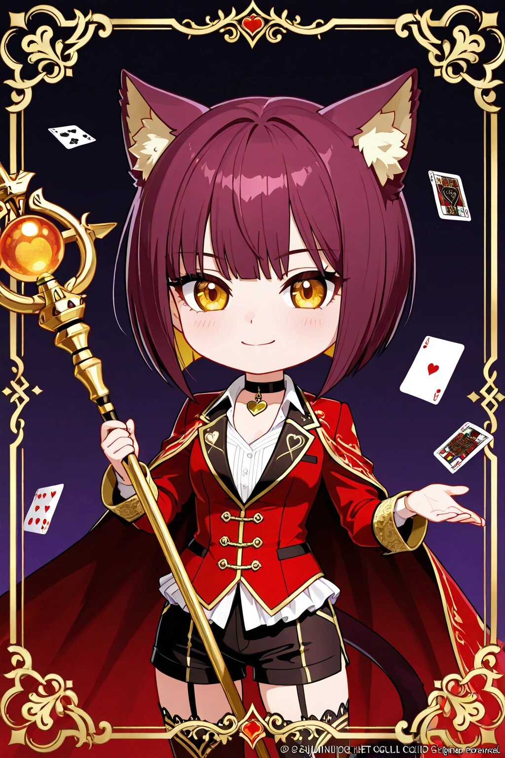 Character (Clavi): Lavender-purple short bob haircut with a silky shine, golden amber eyes reflecting warmth and composure. Prominent realistic cat ears with soft fur detail. Black choker at the neck. Wearing a regal stage costume inspired by the "King of Hearts" playing card — a tailored red-and-gold jacket with embroidered heart motifs along the lapels, ornate golden trim, and a bold heart-shaped emblem at the chest. White undershirt with elegant collar, paired with fitted black shorts and thigh-high stockings. A flowing crimson cape lined with gold cascades behind her, enhancing her presence. She holds a symbolic scepter topped with a heart motif, completing the look. Her expression is a gentle, tender smile that conveys warmth and approachability. Composition (professional photographer POV): Full-body idol portrait on a plain studio backdrop with subtle stylized card-frame accents integrated faintly in the background. Centered in frame, standing with elegant posture, scepter in one hand while the other rests naturally at her side. Captured slightly from a low angle to highlight her regal stage aura while keeping her gentle smile as the main focus. Lighting: Studio spotlight softly illuminating her face and upper body, enhancing the shine of her hair and cat ears. Warm red accent lights highlight the gold trim and heart motifs, while soft fill lighting ensures clarity in shadows. A subtle golden rim light outlines her silhouette, giving depth and emphasizing her graceful presence. Style: Ultra realistic anime style, professional stage costume photography, 8K resolution, crisp details, elegant atmosphere, pastel yet regal tones.